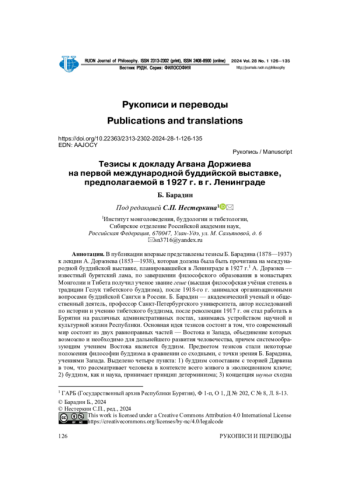В публикации впервые представлены тезисы Б. Барадина (1878-1937) к лекции А. Доржиева (1853-1938), которая должна была быть прочитана на международной буддийской выставке, планировавшейся в Ленинграде в 1927 г. А. Доржиев - известный бурятский лама, по завершении философского образования в монастырях Монголии и Тибета получил ученое звание геше (высшая философская учёная степень в традиции Гелук тибетского буддизма), после 1918-го г. занимался организационными вопросами буддийской Сангхи в России. Б. Барадин - академический ученый и общественный деятель, профессор Санкт-Петербургского университета, автор исследований по истории и учению тибетского буддизма, после революции 1917 г. он стал работать в Бурятии на различных административных постах, занимаясь устройством научной и культурной жизни Республики. Основная идея тезисов состоит в том, что современный мир состоит из двух равноправных частей - Востока и Запада, объединение которых возможно и необходимо для дальнейшего развития человечества, причем системообразующим учением Востока является буддизм. Предметом тезисов стали некоторые положения философии буддизма в сравнении со сходными, с точки зрения Б. Барадина, учениями Запада. Выделено четыре пункта: 1) буддизм сопоставим с теорией Дарвина в том, что рассматривает человека в контексте всего живого в эволюционном ключе; 2) буддизм, как и наука, принимает принцип детерминизма; 3) концепция шуньи сходна с релятивистскими принципами физики; 4) системы психотехник буддизма сходна с теорией рефлексологии. Б. Барадин делает вывод о том, что индо-буддийская и европейская культуры взаимодополняющие и их сближение приведет нас к подлинно общечеловеческой культуре. Представленные тезисы являются, по-видимому, первым систематическим изложением взглядов российских необуддистов обновленцев на конкретные аспекты, позволяющие сблизить буддийскую и западную культуры.