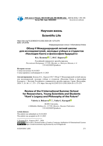 БЕЛЯЕВА В. А., КАРАГОД Ю. Г. ОБЗОР V МЕЖДУНАРОДНОЙ ЛЕТНЕЙ ШКОЛЫ ДЛЯ ИССЛЕДОВАТЕЛЕЙ, МОЛОДЫХ УЧЁНЫХ И СТУДЕНТОВ "НАСЛЕДИЕ КАНТА И ФИЛОСОФИЯ БУДУЩЕГО" // ВЕСТНИК РОССИЙСКОГО УНИВЕРСИТЕТА ДРУЖБЫ НАРОДОВ. СЕРИЯ: ФИЛОСОФИЯ. 2024. Т. 28 № 1 (21 СТ.)