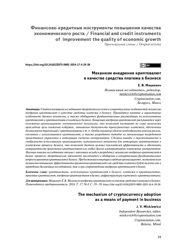 Научная новизна исследования связана с внесением вклада в разработку механизма внедрения криптовалют в бизнес-процессы; теоретическая значимость заключается в обобщении и конкретизации фундаментальных вопросов принятия криптовалют в бизнесе.