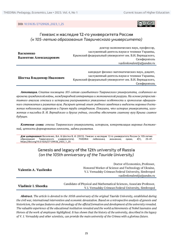 41. Шостка, В. И. (2018a). Роль В.И. Вернадского, местной интеллигенции и научной элиты в становлении первого высшего учебного заведения в Крыму. Крымский архив, 2 (29), 81-92. EDN: WMYVIW