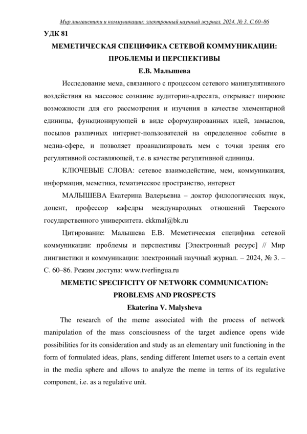 14. Малышева Е.В. Туннель меметического пространства как инструмент распространения “вирусных” идей сетевой коммуникации // Язык. Сознание. Коммуникация: методология и гуманитарные практики (вызовы современности). Материалы II Всероссийской конференции с международным участием. Москва, 8-11 апреля 2024 г. - М.: МГУ, 2024. - С. 251-252. EDN: AVGNET