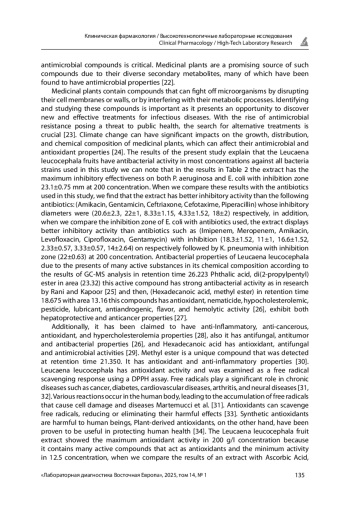 Заключение. По мере развития биотехнологий расширяются представления о химическом составе лекарственных растений. Усовершенствованные методы исследования позволяют извлекать, фракционировать и идентифицировать широкий спектр биологически активных соединений, каждое из которых имеет свою уникальную химическую структуру и механизм действия. Проведенное перспективное исследование показало, что растительный экстракт Leucaena leucocephala обладает противомикробными и антиоксидантными свойствами, что позволяет рассматривать его в качестве одного из потенциальных средств альтернативной медицины.