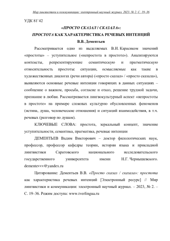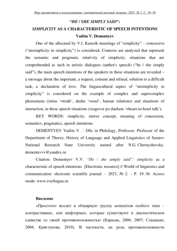Рассматривается одно из выделяемых В. И. Карасиком значений «простоты» - уступительное («непростота в простоте»). Анализируются контексты, репрезентирующие семантическую и прагматическую относительность простоты: ситуации, осмысляемые как такие в художественных диалогах (речи автора) («просто сказал» / «просто сказала»), выявляются основные речевые интенции говорящих в данных ситуациях - сообщение о важном, просьба, согласие и отказ, решение трудной задачи, признание в любви. Рассматривается лингвокультурный аспект «непростоты в простоте» на примере сложных культурно обусловленных феноменов (истина, душа, человеческие отношения) и ситуаций взаимодействия, в т. ч. речевых (разговор по душам).