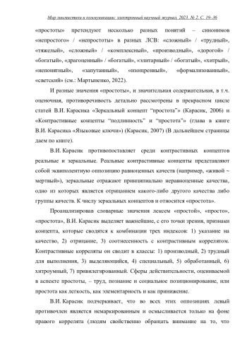 «Простота» входит в обширную группу концептов особого типа – контрастивных, или шифтерных, которые существуют в диалектическом единстве со своей противоположностью (Карасик, 2006; 2007; Слышкин, 2004; Кряхтунова, 2010).