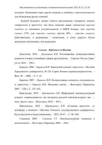 1. Карасик В.И. Зеркальный концепт “простота” // Вестник Харьковского университета. № 726. Серия: Романо-германская филология. - Вып. 49. - 2006. - С. 5-14.
