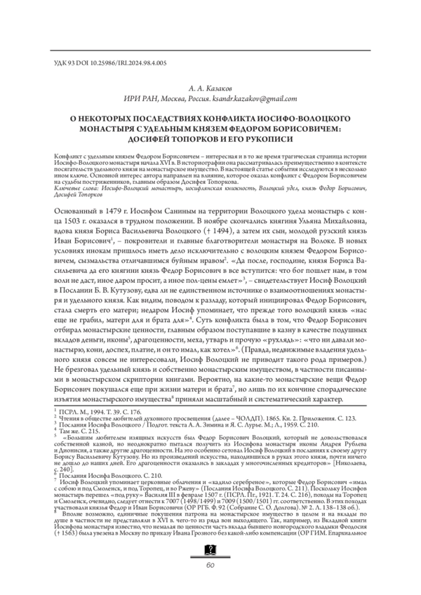 Конфликт с удельным князем Федором Борисовичем – интересная и в то же время трагическая страница истории Иосифо-Волоцкого монастыря начала XVI в. В историографии она рассматривалась преимущественно в контексте посягательств удельного князя на монастырское имущество. В настоящей статье события исследуются в несколько ином ключе. Основной интерес автора направлен на влияние, которое оказал конфликт с Федором Борисовичем на судьбы постриженников, главным образом Досифея Топоркова.