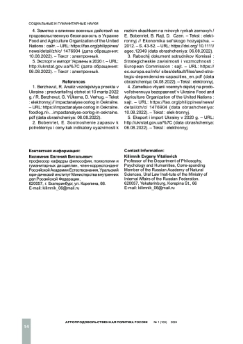 КИЛИМНИК Е. В. МИРОВАЯ ПРОДОВОЛЬСТВЕННАЯ БЕЗОПАСНОСТЬ НА ФОНЕ САНКЦИОННОЙ ПОЛИТИКИ К РОССИИ В 2022-2023 ГГ // АГРОПРОДОВОЛЬСТВЕННАЯ ПОЛИТИКА РОССИИ. 2024. №1