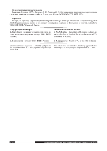 5. Петуховский М. А. Расследование действий, дезорганизующих работу исправительно-трудовых учреждений: учеб. пособие. Караганда: КВШ МВД СССР, 1980. С. 34-35.