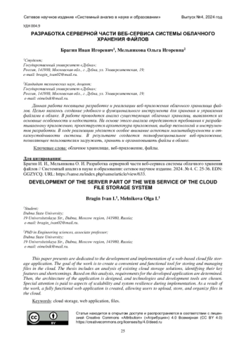 Данная работа посвящена разработке и реализации веб-приложения облачного хранилища файлов. Целью являлось создание удобного и функционального инструмента для хранения и управления файлами в облаке. В работе проводится анализ существующих облачных хранилищ, выявляются их основные особенности и недостатки. На основе этого анализа определяются требования к разрабатываемому приложению, проектируется архитектура приложения, выбор технологий и инструментов разработки. В ходе реализации уделяется особое внимание аспектам масштабируемости и отказоустойчивости системы. В результате создается полнофункциональное веб-приложение, позволяющее пользователям загружать, хранить и организовывать файлы в облаке.