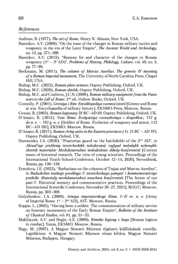 3. Банников 2015 - Банников А.В. Причины и характер изменений в римском вооружении (I-III вв. н. э.) // Проблемы истории, филологии, культуры. 2015. № 3 (49). С. 77-90.