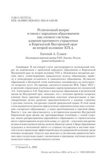 В настоящей статье рассматривается религиозный вопрос во взаимосвязи с проблемой народного образования в Киргизской Внутренней орде во второй половине XIX в. Неизбежное внедрение русских школ, олицетворявших гражданскую модель образования, привело к конкуренции исламского и гражданского образования. Исламское образование в Казахской степи изначально основывалось на деятельности татарских мулл. На примере документа комиссии Ф. К. Гирса 1873 г. и сведений, отраженных в публикациях дореволюционных исследователей А. Е. Алекторова и А. Н. Харузина о школьном образовании и религиозной жизни во Внутренней орде, показано, что с течением времени татарское влияние было признано имперскими властями нежелательным и противоречащим целям развития гражданственности у казахов, единения с русским этносом, построения единой гражданской нации. В этой связи стали выдвигаться проекты определенных ограничительных мер в отношении «татарского образования», а также протекционизм в торговой сфере. Вместе с тем, как представляется, в историческом развитии Внутренней Киргизской орды видны две противоречивые тенденции: с одной стороны, начало распространения европейского образования со строительством школ с преподаванием на русском языке, а с другой – усиленное внедрение ислама в повседневную жизнь казахов Джангер-ханом. Сфера образования нуждалась в постоянной заботе со стороны государства и местных властей в целях проведения эффективной аккультурационной политики среди кочевых инородцев. Одна из мер виделась в увеличении правительственных школ на русском языке с включением в программу изучения родного казахского языка и магометанского учения.
