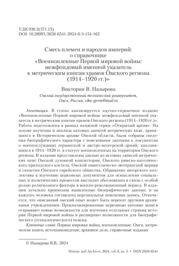 В статье анализируется научно-справочное издание «Военнопленные Первой мировой войны: межфондовый именной указатель к метрическим книгам храмов Омского региона (1914–1920 гг.)». Работа подготовлена в рамках книжной серии «Открытый архив». На основе изучения и анализа актовых записей метрических книг, хранящихся в Историческом архиве Омской области, были собраны сведения биографического характера с поисковыми данными к документам о военнослужащих германской и австро-венгерской армий, находившихся в 1914–1920 гг. в статусе военнопленных на территории Омского региона. В издании представлены данные из актовых записей метрических книг Омской духовной консистории, Омского римско-католического приходского костела, Омской евангелическо-лютеранской церкви и синагоги Омского еврейского общества. Обращение авторского коллектива к изучению церковных документов для осмысления социальных и политических процессов выглядит обоснованно в связи с особой ролью религиозного фактора в военно-революционный период. В издании детально прописаны выявленные биографические данные, и на каждого человека составлена персональная поисковая запись. Отмечается, что описанный омский опыт может быть перенят другими архивными учреждениями. Проанализированные церковные актовые записи открывают новые возможности для изучения отдельных страниц истории Первой мировой войны и расширяют возможности для биографического (генеалогического) поиска.