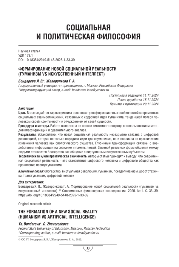 Результаты. Установлено, что новая социальная реальность неразрывно связана с цифровой революцией, которая не только породила идеи трансгуманизма, но и повлияла на практические изменения человека как биологического существа. Глубинные трансформации связаны с воздействием информации на сознание и память людей. Заменой реальных форм общения между людьми становится блогерство как общение с виртуальным искусственным субъектом.