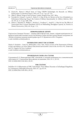 10. Стрельников Д. О. Биотехнологическое конструирование «солдата будущего»: трансгуманистический вектор военной деятельности // Философская мысль. 2022. № 1. С. 85-95.