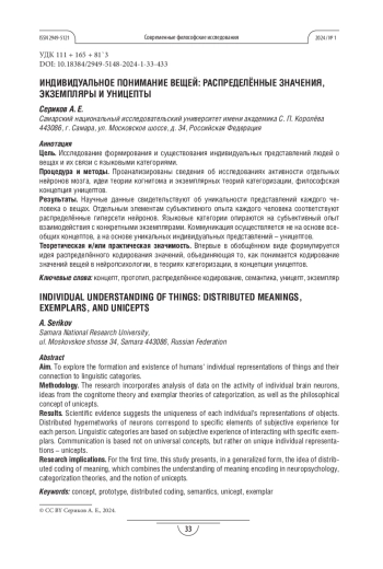 Результаты. Научные данные свидетельствуют об уникальности представлений каждого человека о вещах. Отдельным элементам субъективного опыта каждого человека соответствуют распределённые гиперсети нейронов. Языковые категории опираются на субъективный опыт взаимодействия с конкретными экземплярами. Коммуникация осуществляется не на основе всеобщих концептов, а на основе уникальных индивидуальных представлений – уницептов.