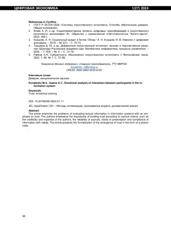 КОВАЛЕНКО М. А., ИСАЕВА А. В. ЭМОЦИОНАЛЬНЫЙ АНАЛИЗ ВЗАИМОДЕЙСТВИЯ УЧАСТНИКОВ ИНФОРМАЦИОННОЙ СИСТЕМЫ // ЦИФРОВАЯ ЭКОНОМИКА. 2024. № 1 (27)