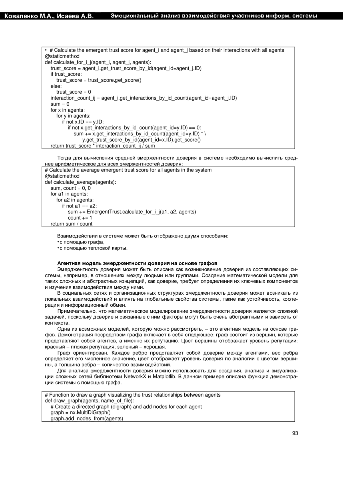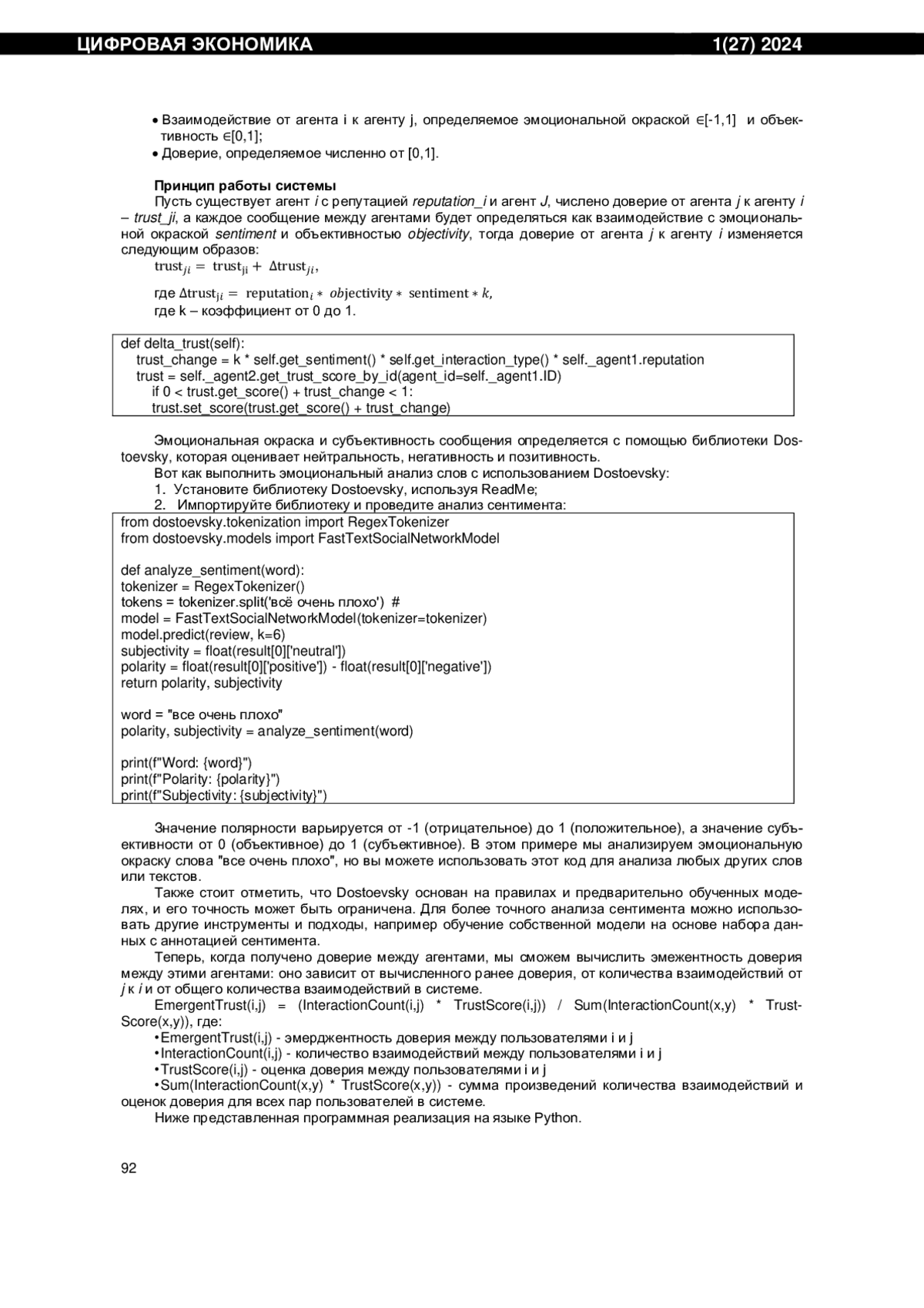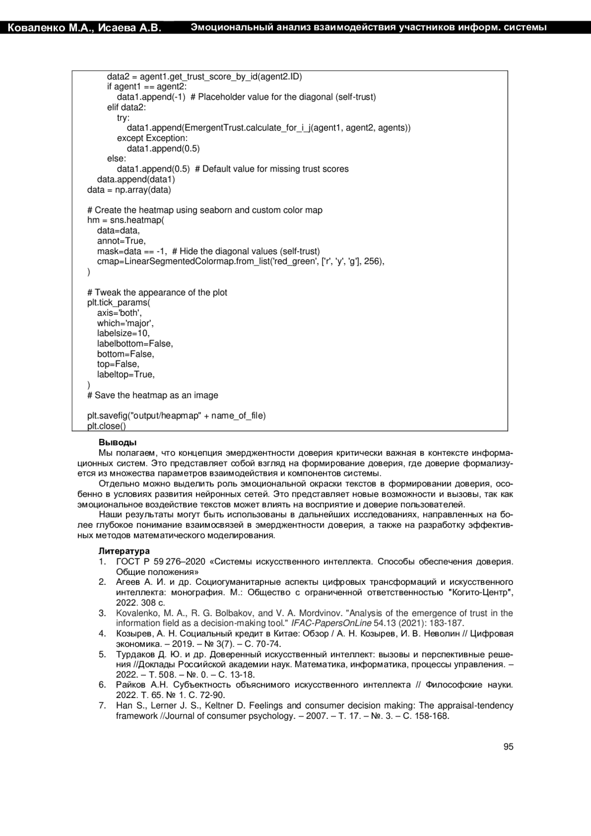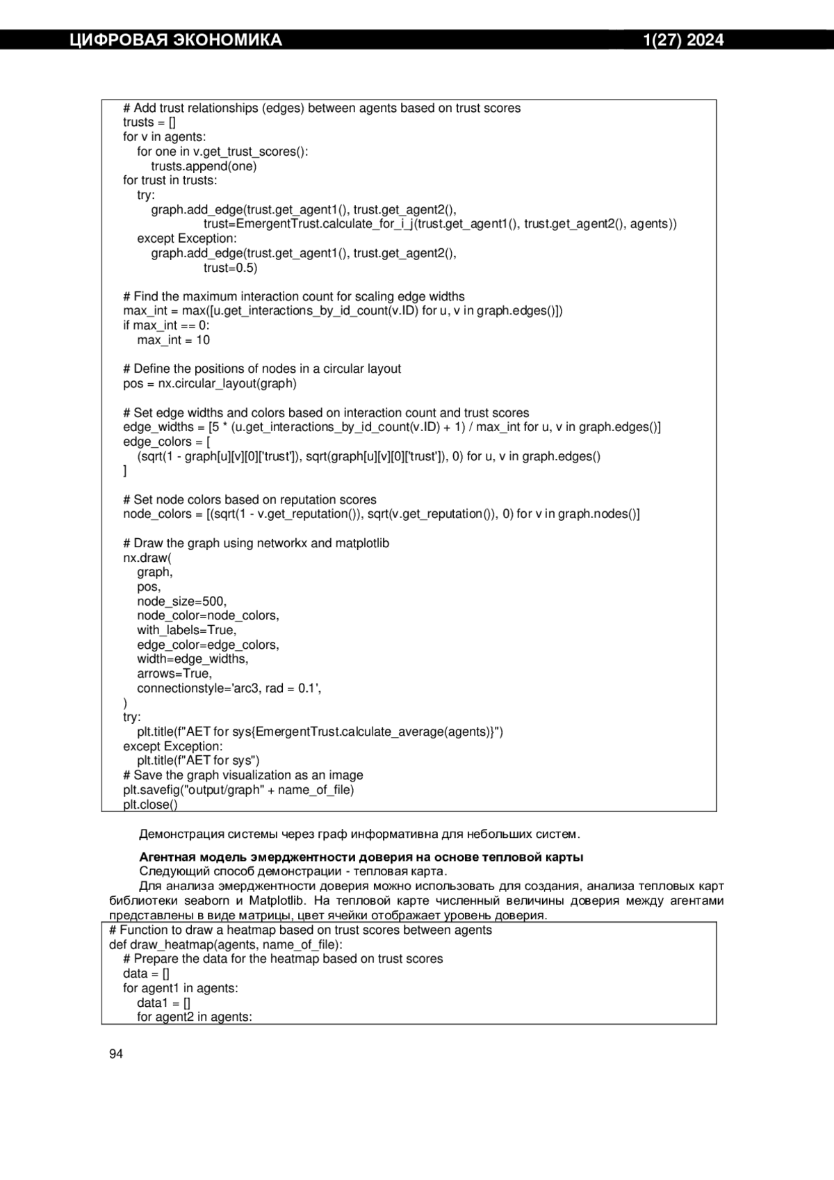 В статье рассматривается проблем оценки текстовой информации в информационных системах с акцентом на доверие. Авторы подчеркивают важность формирования доверия по различным критериям, таким как авторитетность и экспертность авторов, надежность источников, ясность изложения и соответствие информации потребностям. В статье представлена формализация эмерджентности доверия в виде кода на phyton.