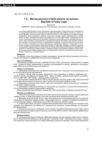 На примере серийного дела «Рикор Электроникс» рассматривается метод расчета ставок роялти за использование объектов интеллектуальной собственности для судебных экспертиз и сделок на основе Big Data и нечеткой логики. Метод «LABRATE ROYALTY PRO» базируется на трех ключевых показателях: доля лицензиара в прибыли лицензиата (Licensor’s Share), рентабельность продаж (Return on Sales, операционная маржа) и рентабельность по EBIT (EBIT Margin, операционная доходность). Применение традиционных методов, основанных на рентабельности производства или затрат, часто приводит к расхождениям с показателями выручки от продаж, что требует адаптации подходов к российским реалиям и международной практике. В статье детально описан алгоритм расчета, основанный на анализе финансовых показателей компаний и отраслевой статистике, а также на использовании технологий Big Data и Fuzzy Logic. Примеры из судебной практики подтверждают эффективность предложенного подхода, обеспечивая объективные и справедливые решения по определению ставок роялти, стоимости права использования товарных знаков и расчета компенсаций. Особое внимание уделено необходимости точного и однозначного описания объектов исследования и исходных данных.