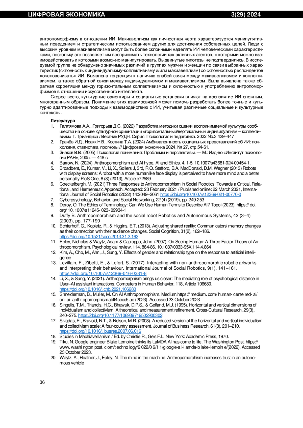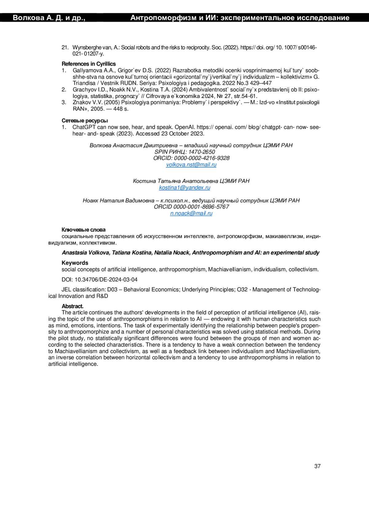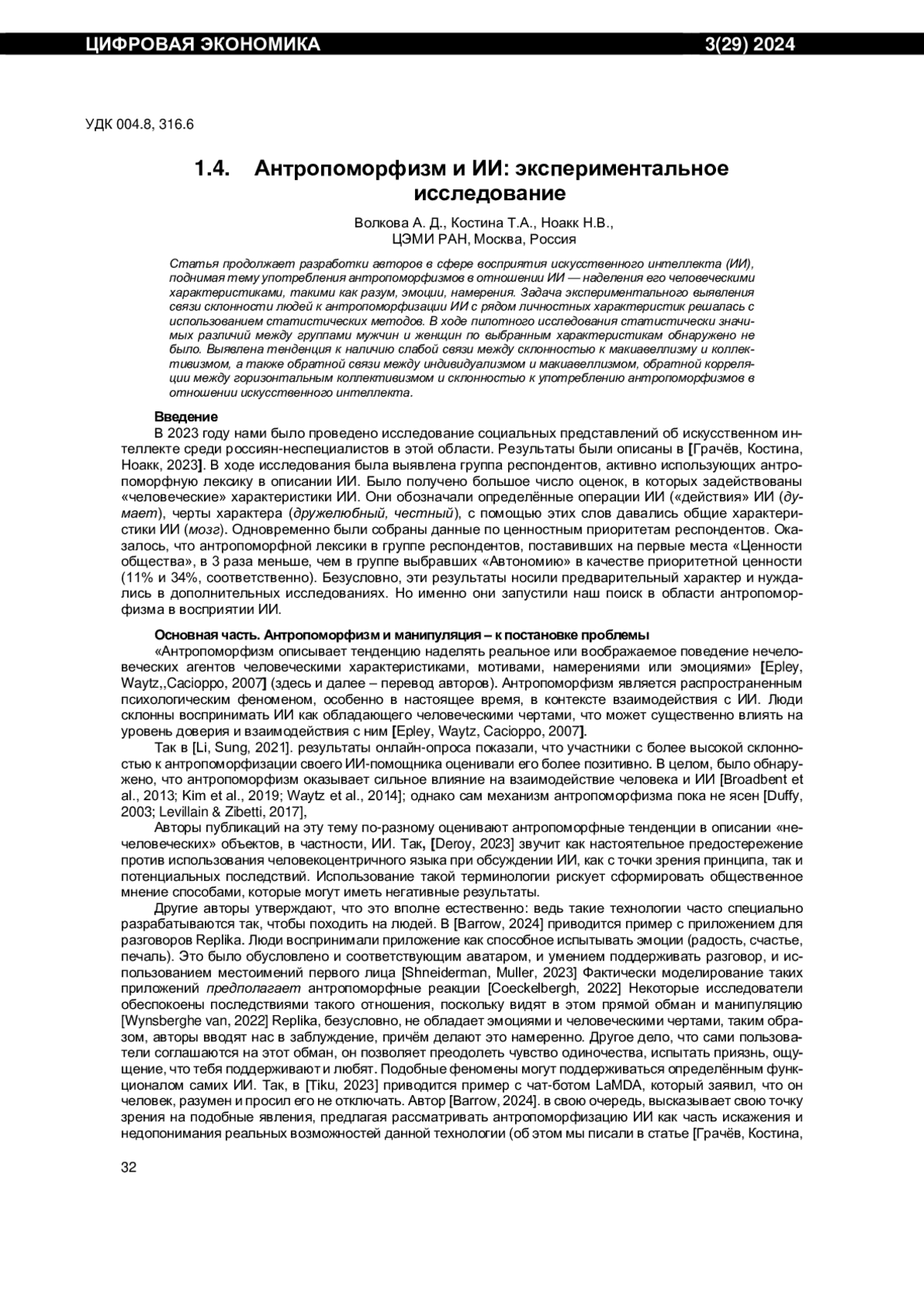 2. Грачёв И.Д., Ноакк Н.В., Костина Т.А. (2024) Амбивалентность социальных представлений об ИИ: психология, статистика, прогнозы // Цифровая экономика 2024, № 27, стр.54-61. EDN: BUQWBV