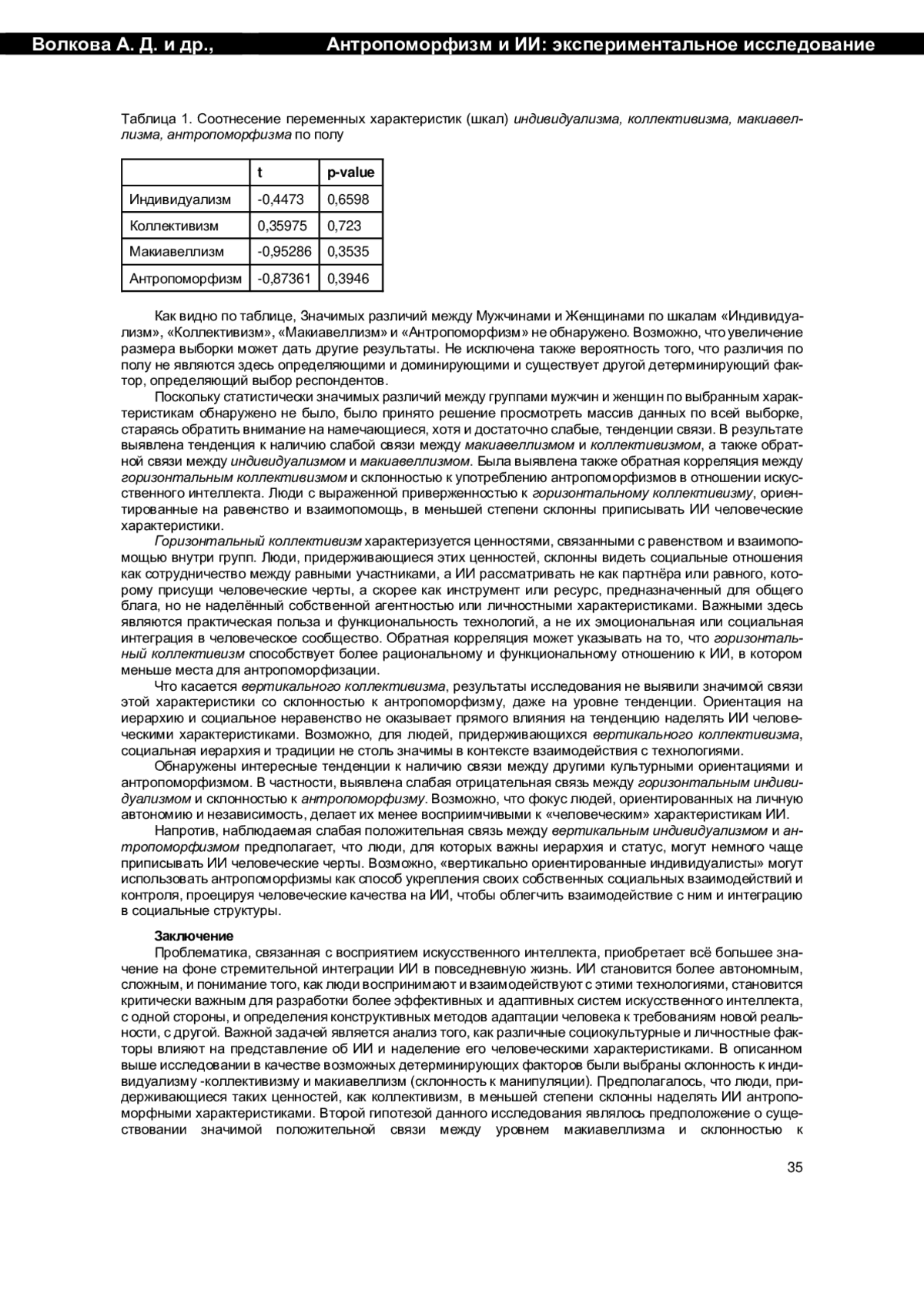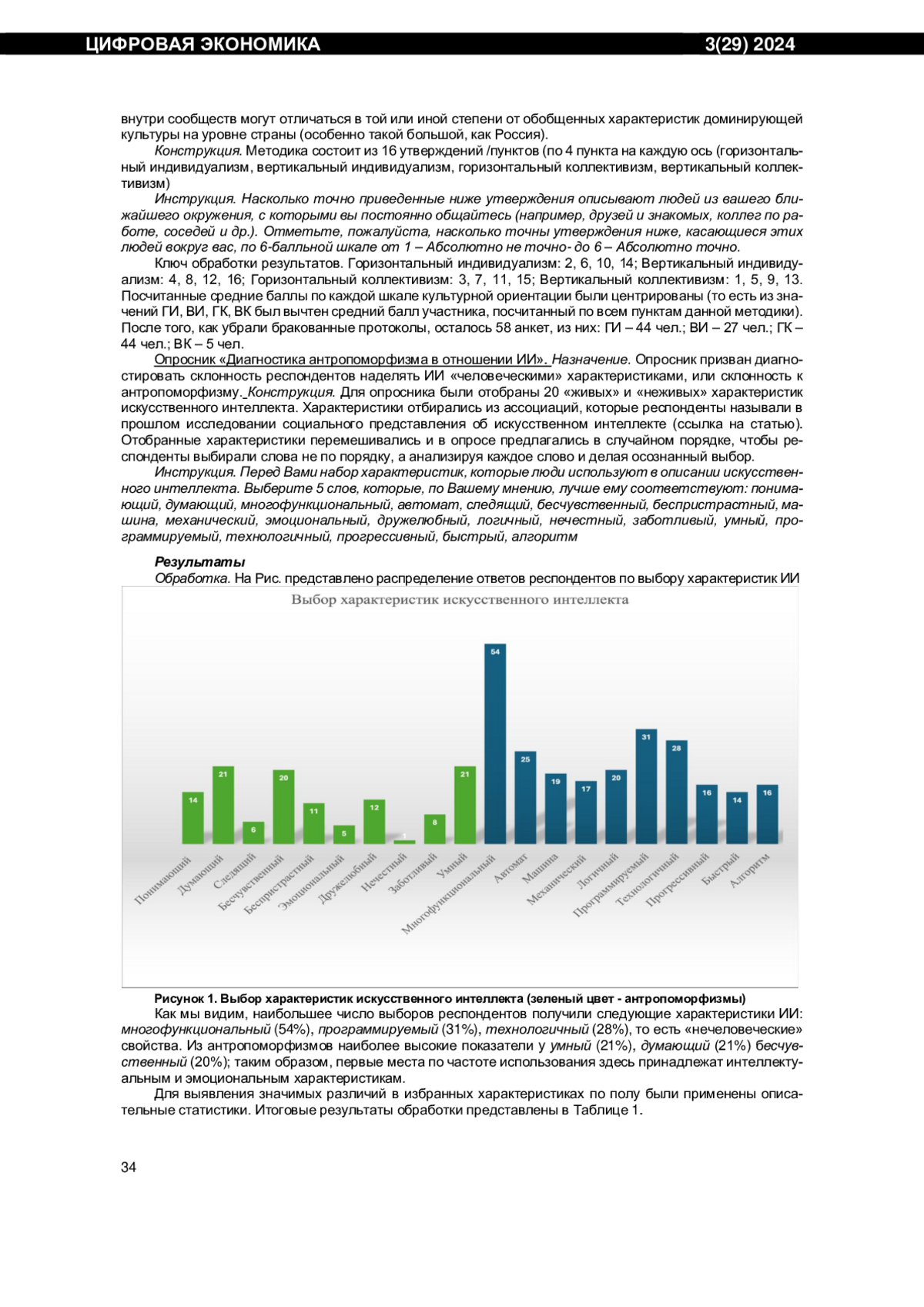 В 2023 году нами было проведено исследование социальных представлений об искусственном интеллекте среди россиян-неспециалистов в этой области. Результаты были описаны в [Грачёв, Костина, Ноакк, 2023]. В ходе исследования была выявлена группа респондентов, активно использующих антропоморфную лексику в описании ИИ. Было получено большое число оценок, в которых задействованы «человеческие» характеристики ИИ. Они обозначали определённые операции ИИ («действия» ИИ (думает), черты характера (дружелюбный, честный), с помощью этих слов давались общие характеристики ИИ (мозг). Одновременно были собраны данные по ценностным приоритетам респондентов. Оказалось, что антропоморфной лексики в группе респондентов, поставивших на первые места «Ценности общества», в 3 раза меньше, чем в группе выбравших «Автономию» в качестве приоритетной ценности (11% и 34%, соответственно). Безусловно, эти результаты носили предварительный характер и нуждались в дополнительных исследованиях. Но именно они запустили наш поиск в области антропоморфизма в восприятии ИИ.
