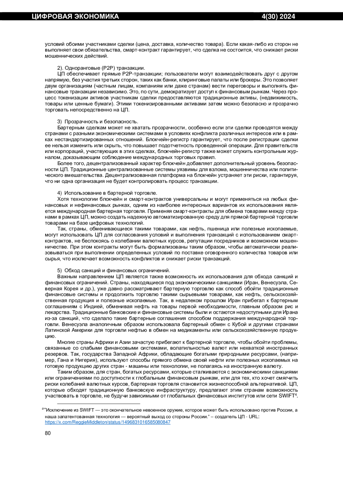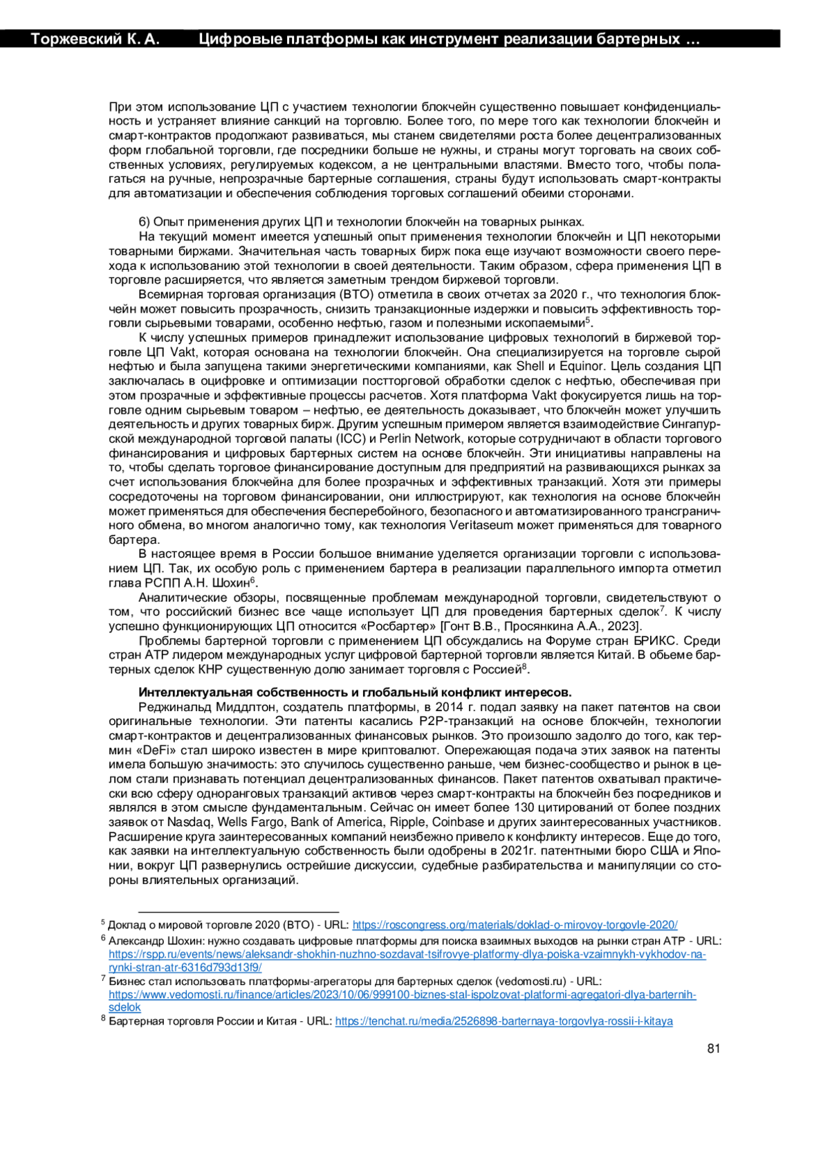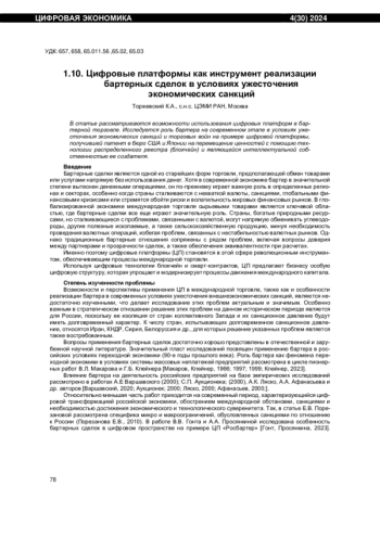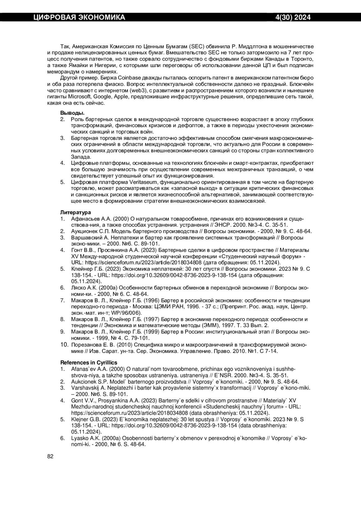 4. Гонт В.В., Просянкина А.А. (2023) Бартерные сделки в цифровом пространстве // Материалы XV Международной студенческой научной конференции “Студенческий научный форум” - URL: https://scienceforum.ru/2023/article/2018034808 (дата обращения: 05.11.2024).