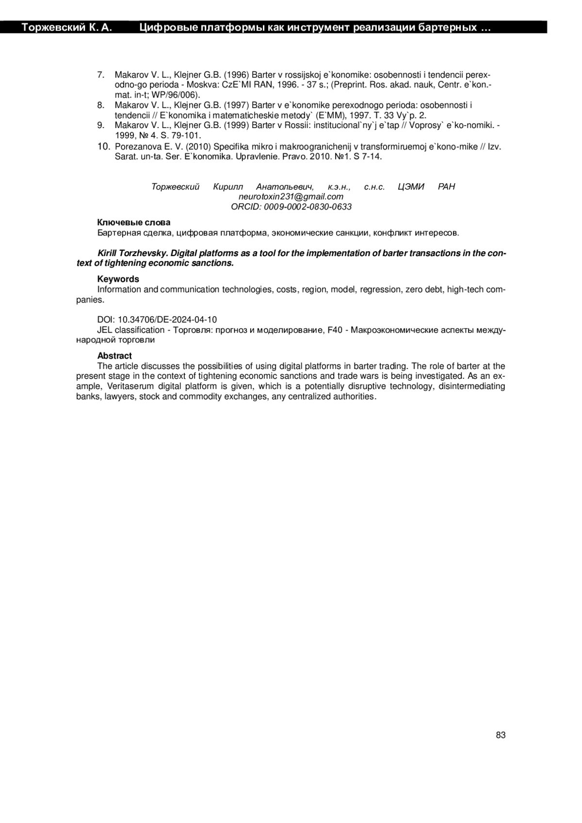 9. Макаров В. Л., Клейнер Г.Б. (1999) Бартер в России: институциональный этап // Вопросы экономики. - 1999, № 4. С. 79-101. EDN: VJTBUJ