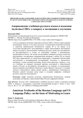 Статья посвящена изучению языковой политики США в области преподавания иностранных языков, в том числе русского, и взаимосвязи языковой политики и стратегии национальной безопасности страны. В то же время, из-за отсутствия федерального регулирования в сфере преподавания иностранных языков создание и использование учебников русского языка как иностранного не регламентируется и отдано на усмотрение учебных и региональных организаций на местах. На основе исследования учебников русского языка как иностранного, составленных американскими авторами с начала ХХ по начало ХХI века, проведенного по нескольким параметрам: содержание предисловий, методической и мотивационной составляющей, текстового и лексического материала, а также целевой аудитории, автор статьи приходит к выводу о том, что учебники не отражают реальной картины культурной и общественной жизни в России, не мотивируют обучающихся, не успевают за изменениями, происходящими в российском обществе и таким образом участвуют в создании ложного стереотипного образа нашей страны у американских обучающихся. Решение данной ситуации автор видит в создании цифровых учебников русского языка как иностранного.