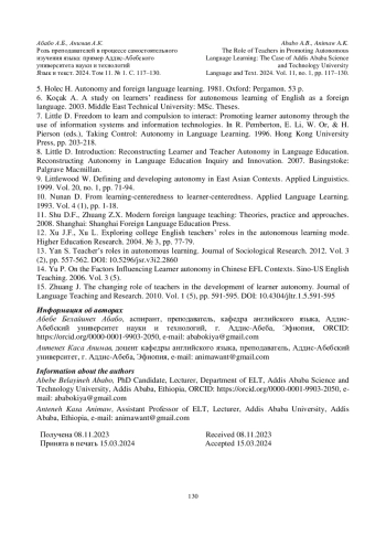 1. Alonazi S.M. The role of teachers in promoting learner autonomy in secondary schools in Saudi Arabia // English Language Teaching. 2017. Vol. 10, no. 7, pp. 183-202. DOI: 10.5539/elt.v10n7p183