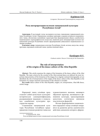 В настоящей статье исследуются истоки становления танцевальной культуры Республики Алтай. Определены основные критерии создания алтайского национального танца, обозначены важнейшие характеристики формирования образа самобытного, национального хореографического искусства, выявлена роль интерпретации истоков танцевальной культуры Республики Алтай в формировании уникального национального сознания алтайцев.