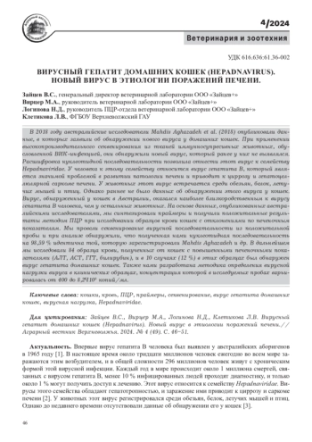 В 2018 году австралийские исследователи Mahdis Aghazadeh et al. (2018) опубликовали данные, в которых заявили об обнаружении нового вируса у домашних кошек. При применении высокопроизводительного секвенирования из тканей иммунносупресивных животных, обусловленной ВИК-инфекцией, они обнаружили новый вирус, который ранее у них не выявлялся. Расшифровка нуклеотидной последовательности позволила отнести этот вирус к семейству Hepadnaviridae. У человека к этому семейству относится вирус гепатита В, который является значимой проблемой в развитии патологии печени и приводит к циррозу и гепатоцеллюлярной саркоме печени. У животных этот вирус встречается среди обезьян, белок, летучих мышей и птиц. Однако раннее не было данных об обнаружении этого вируса у кошек. Вирус, обнаруженный у кошек в Австралии, оказался наиболее близкородственным к вирусу гепатита В человека, чем у остальных животных. На основе данных, опубликованных австралийскими исследователями, мы синтезировали праймеры и получили положительные результаты методом ПЦР при исследовании образцов крови кошек с отклонениями по печеночным показателям. Мы провели секвенирование вирусной последовательности из положительной пробы и при анализе обнаружили, что полученная нами нуклеотидная последовательность на 98,59 % идентична той, которую зарегистрировали Mahdis Aghazadeh и др. В дальнейшем мы исследовали 84 образца крови, полученных от кошек с повышенными печеночными показателями (АЛТ, АСТ, ГГТ, билирубин), и в 10 случаях (12 %) в этих образцах был обнаружен вирус гепатита домашних кошек. Также нами разработана методика определения вирусной нагрузки вируса в клинических образцах, концентрация которой в исследуемых пробах варьировалась от 400 до 8,2410е копий/мл.