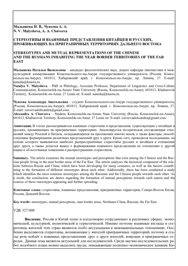 В статье рассматриваются взаимные стереотипы и представления, существующие у китайцев и русских, проживающих на приграничных территориях.