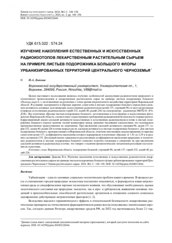 Цель настоящего исследовани − изучение особенностей аккумуляции радиоизотопов природного и техногенного происхождения в лекарственном растительном сырье на примере листьев подорожника большого (Plantago major L.), заготовленных на различных с точки зрения антропогенного воздействия территориях Воронежской области. В условиях эксперимента в образцах верхних слоев почв и листьях подорожника большого определяли удельную активность основных долгоживущих искусственных радиоизотопов (цезий-137, стронций-90,) и часто встречаемых в природе естественных радионуклидов (торий-232, калий-40, радий-226) на спектрометре - радиометре МКГБ-01 «РАДЭК». Все изученные образцы листьев подорожника большого, заготовленные в естественных и искусственных фитоценозах Воронежской области, соответствует существующим требованиям радиационной безопасности (первая группа). Корреляционный анализ удельной активности искусственных и естественных радионуклидов в почве и листьях подорожника большого показал наличие тесной взаимосвязи между данными числовыми показателями, что подтвердило преимущественное транспочвенное их загрязнение. При увеличении удельной активности стронция-90, цезия-137, тория-232, калия-40, радия-226 в почве возрастала их удельная активность в листьях подорожника большого. Для листьев подорожника большого, произрастающего в Воронежской области, отмечено интенсивное аккумулирование из верхних слоев почв цезия-137, коэффициенты накопления которого варьировали в изученных образцах от 1.81 до 3.29 и в среднем составляли 2.55. Детальный анализ зависимости рассчитанных коэффициентов накопления природных и техногенных радиоизотопов в листьях подорожника большого позволил отметить тенденции к снижению их при увеличении удельной активности радионуклида в почве, что говорит о наличии физиологических механизмов регуляции поступления их в растение.