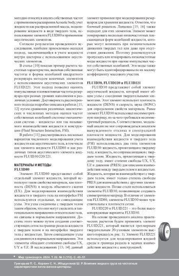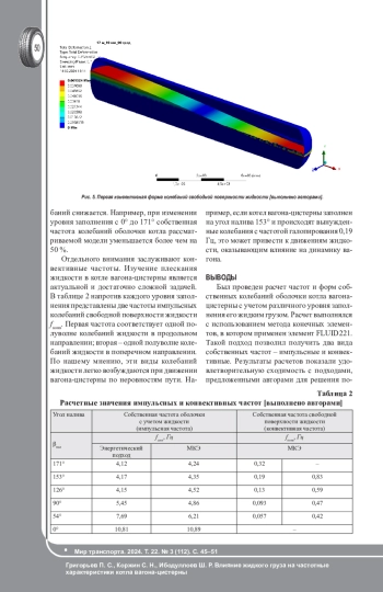 Статья посвящена исследованию влияния уровня заполнения жидким грузом на частотные характеристики оболочки котла вагона-цистерны. В рамках работы применен подход, используемый для оценки частот и форм собственных колебаний стальных резервуаров под воздействием сейсмических нагрузок. Данный подход предполагает учет двух компонентов собственных частот: импульсивной и конвективной. Для определения перечисленных частот и форм собственных колебаний выбран метод конечных элементов с использованием акустических элементов FLUID221. Выбор метода обоснован в ранее проведенных исследованиях авторов. С использованием выбранного метода были исследованы конвективные собственные частоты колебаний свободной поверхности жидкости и импульсные частоты собственных колебаний с различным уровнем заполнения жидким грузом котла вагона-цистерны. Подтверждение достоверности результатов для импульсных частот оболочки, содержащей жидкость, обеспечивается согласованностью с данными, полученными авторами в предшествующих работах с использованием полубезмоментной теории оболочек. Полный текст статьи в переводе на английский язык публикуется во второй части данного выпуска.
