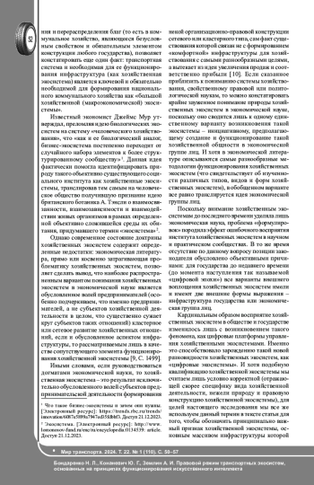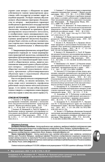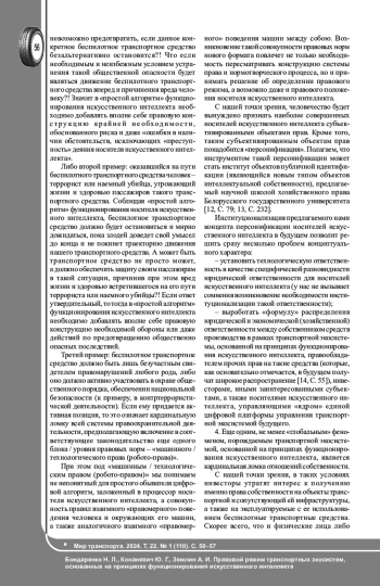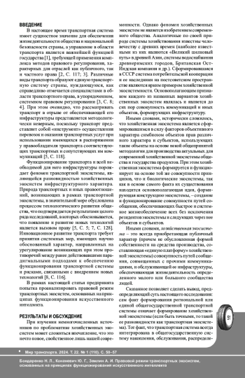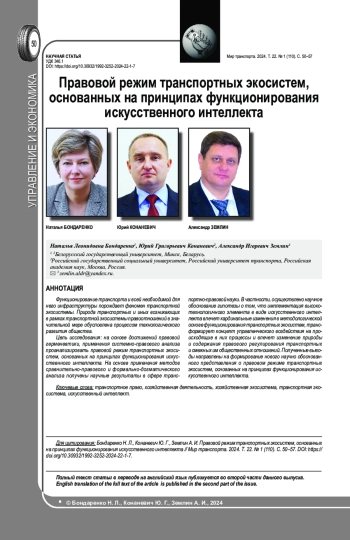 Функционирование транспорта и всей необходимой для него инфраструктуры порождает феномен транспортной экосистемы. Природа транспортных и иных возникающих в рамках транспортной экосистемы правоотношений в значительной мере обусловлена процессом технологического развития общества. Цель исследования: на основе достижений правовой герменевтики, применения системно-правового анализа проанализировать правовой режим транспортных экосистем, основанных на принципах функционирования искусственного интеллекта. На основе применения методов сравнительно-правового и формально-догматического анализа получены научные результаты в сфере транспортно-правовой науки. В частности, осуществлено научное обоснование гипотезы о том, что имплементация высокотехнологичного элемента в виде искусственного интеллекта влечет кардинальные изменения в методологической основе функционирования транспортных экосистем, трансформирует концепт управленческого воздействия на происходящие в них процессы и влечет изменение природы и содержания правового регулирования транспортных и смежных им общественных отношений. Полученные выводы направлены на формирование нового научно обоснованного представления о правовом режиме транспортных экосистем, основанных на принципах функционирования искусственного интеллекта. Полный текст статьи в переводе на английский язык публикуется во второй части данного выпуска.