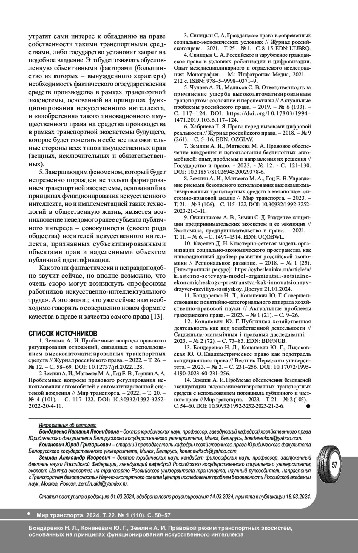 14. Землин А. И. Проблемы обеспечения безопасной эксплуатации высокоавтоматизированных транспортных средств с использованием потенциала публичного и частного права // Мир транспорта. - 2023. - Т. 21. - № 2 (105). - С. 54-60. DOI: 10.30932/1992-3252-2023-21-2-6 EDN: LUMNTS
