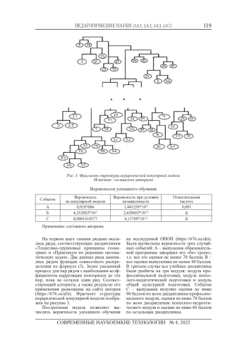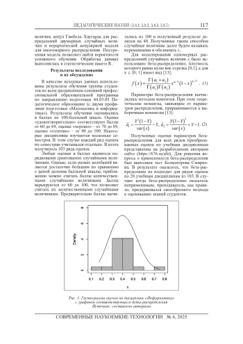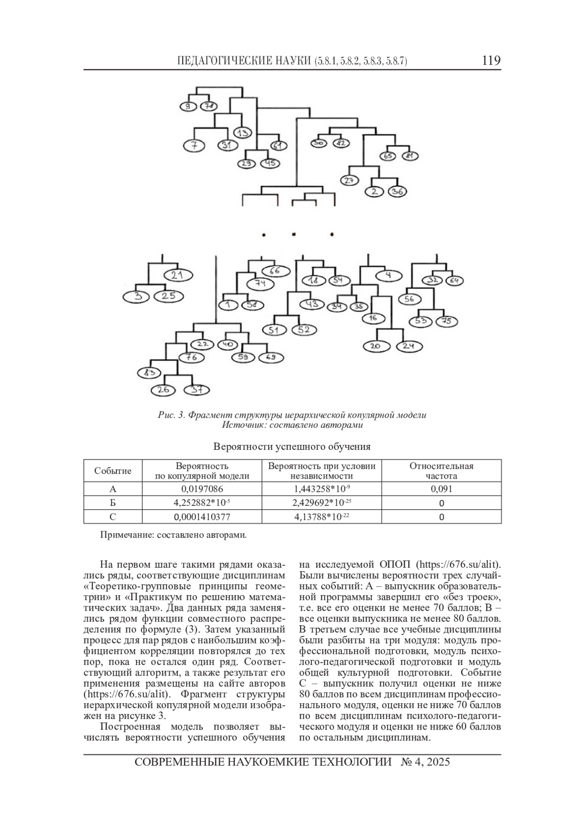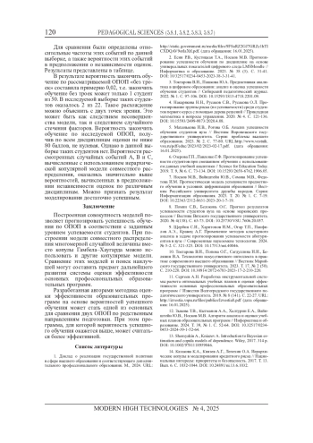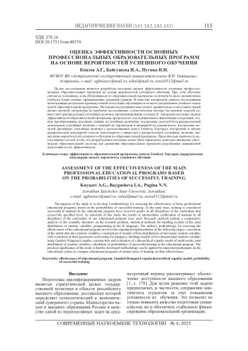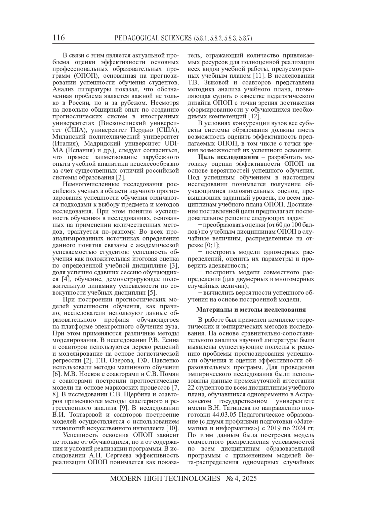 Целью исследования является разработка методики оценки эффективности основных профессиональных образовательных программ на основе вероятностей успешного обучения. При этом обучение считается успешным, если обучающиеся по образовательной программе получили по всем дисциплинам учебного плана оценки, превышающие заданный уровень. В качестве материалов данного исследования использованы результаты промежуточной аттестации обучающихся по всем дисциплинам учебного плана одной образовательной программы. Методами исследования выступают сравнительно-сопоставительный анализ научной литературы по проблеме исследования, статистические методы построения моделей совместного распределения случайных величин, программирование на языке R. Авторская методика оценки эффективности образовательной программы предполагает последовательное выполнение следующих этапов: преобразование исходных данных в случайные величины; построение моделей бета-распределений одномерных случайных величин с оценкой их параметров и проверкой на адекватность; построение моделей двумерных случайных величин с использованием копул Гамбела-Хаугарда; построение и оценка иерархической копулярной модели многомерного совместного распределения случайных величин; вычисление вероятностей успешного обучения по образовательной программе. Практическая значимость исследования состоит в том, что разработанная методика может быть применена заинтересованными участниками образовательной системы для сравнения образовательных программ родственных направлений подготовки по их эффективности.