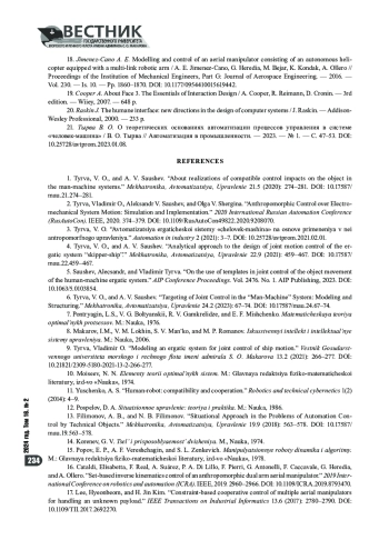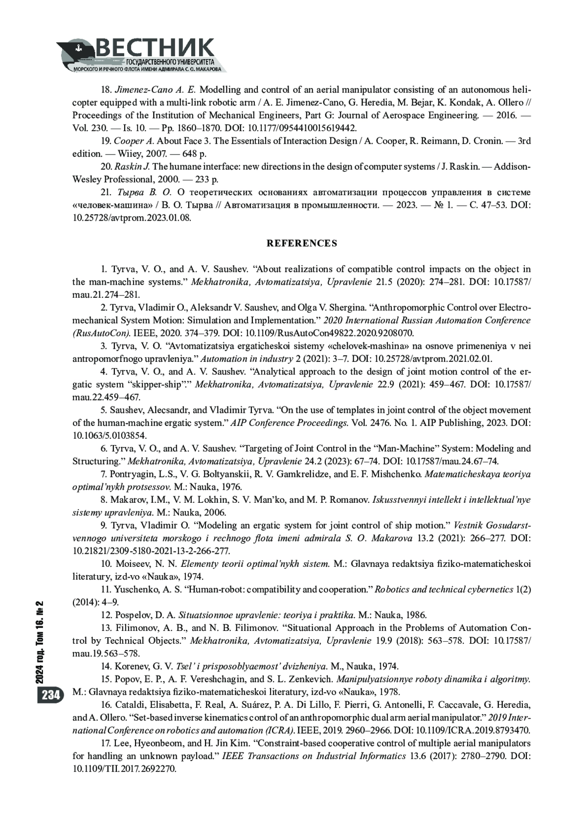 3. Тырва В. О. Автоматизация эргатической системы “человек-машина” на основе применения в ней антропоморфного управления / В. О. Тырва // Автоматизация в промышленности. - 2021. - № 2. - С. 3-7. DOI: 10.25728/avtprom.2021.02.01 EDN: FAXKJH