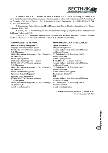 1. Тырва В. О. О реализации совмещаемых управляющих воздействий на объект в системах “человекмашина” / В. О. Тырва, А. В. Саушев // Мехатроника, автоматизация, управление. - 2020. - Т. 21. - № 5. - С. 274-281. DOI: 10.17587/mau.21.274-281 EDN: MCANSG