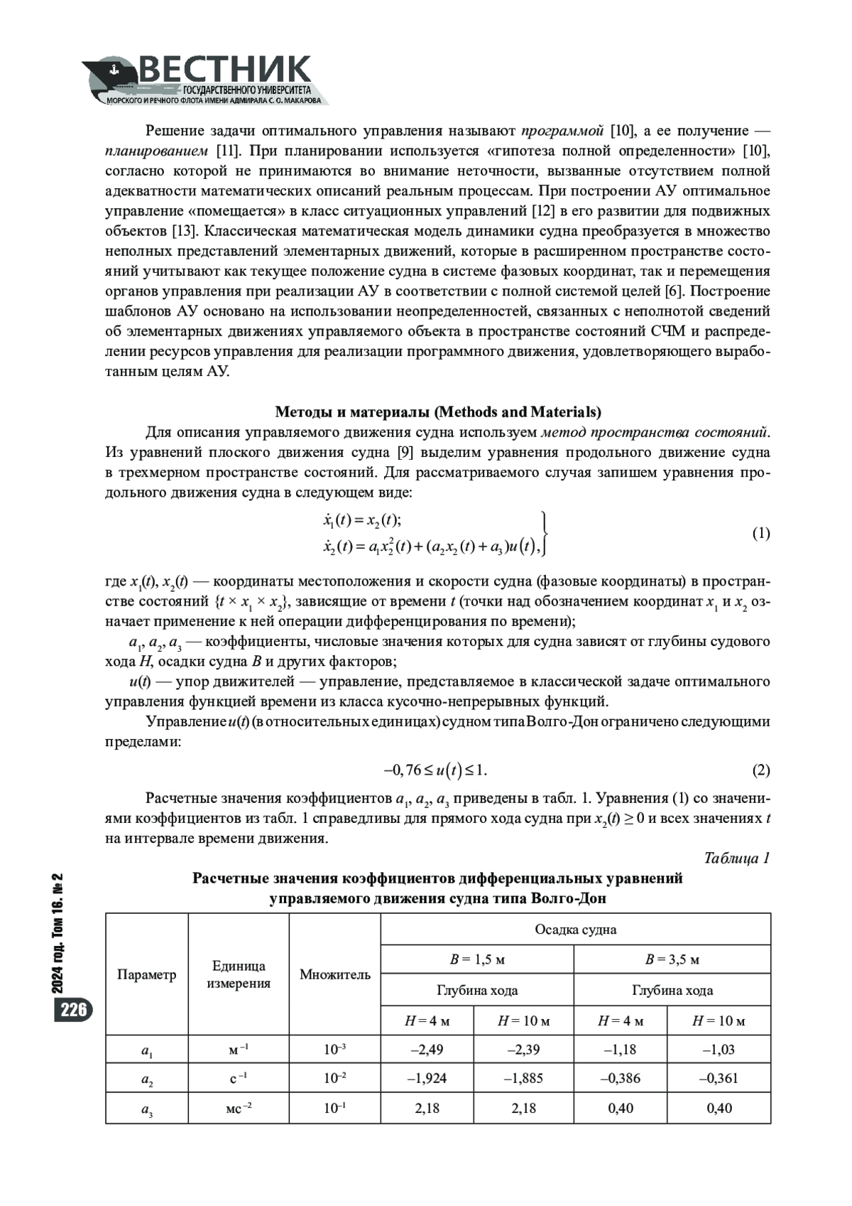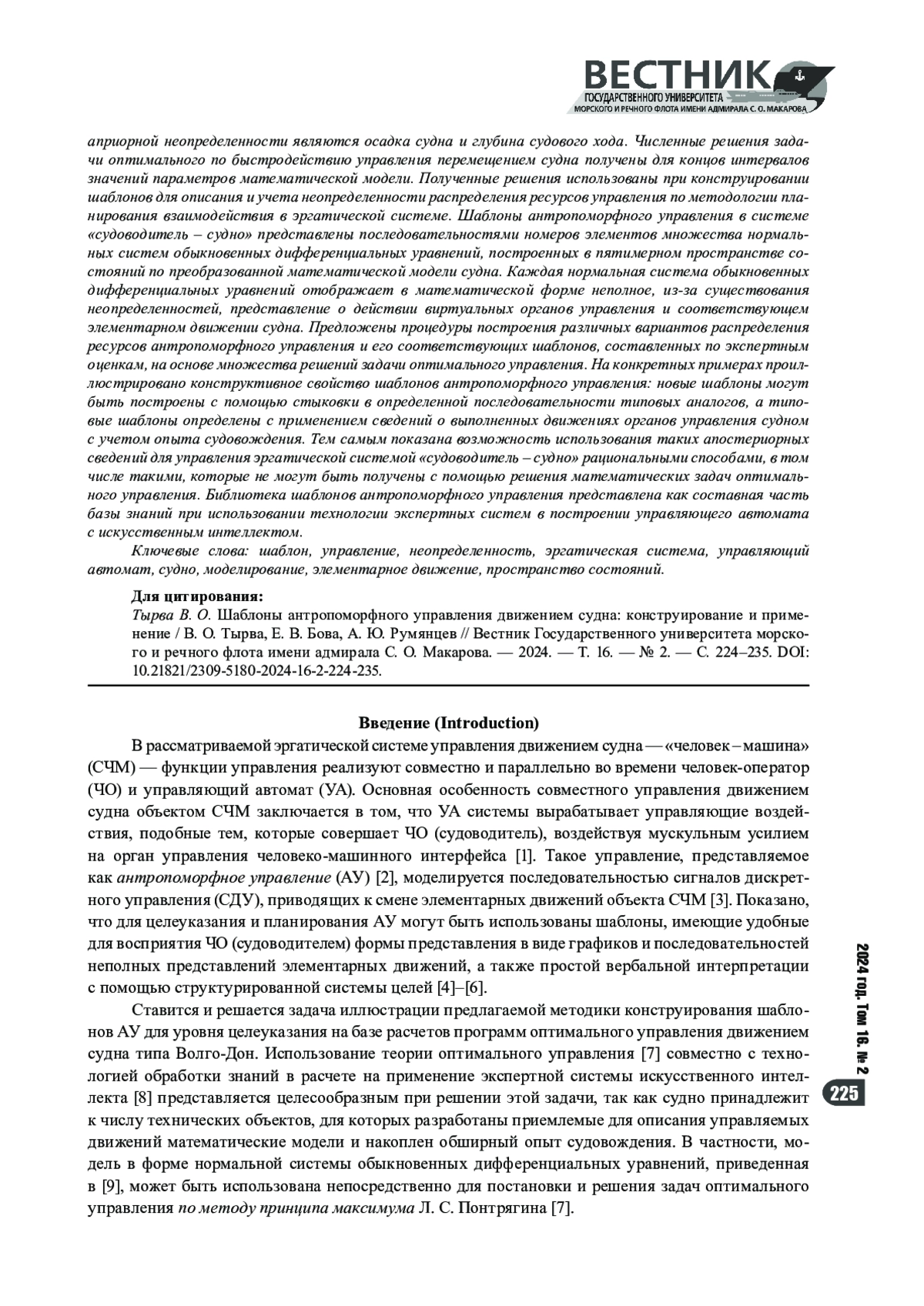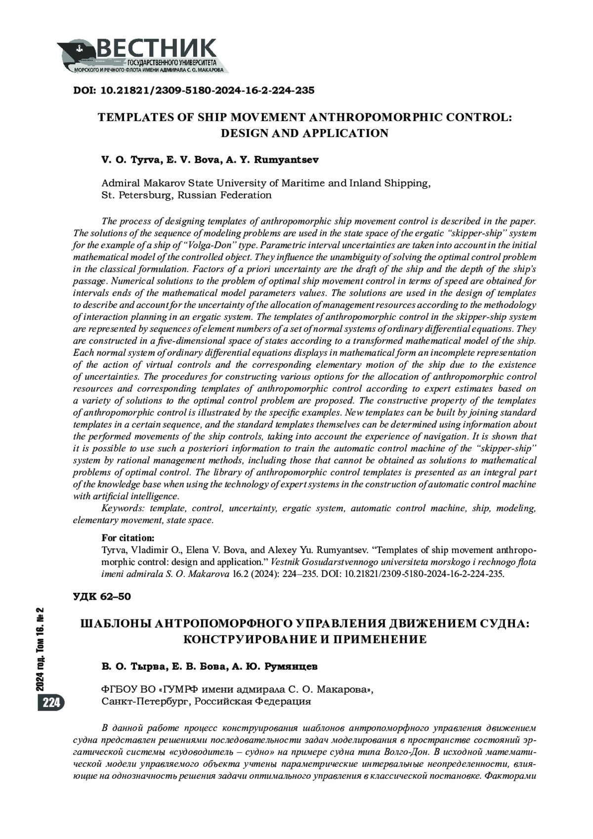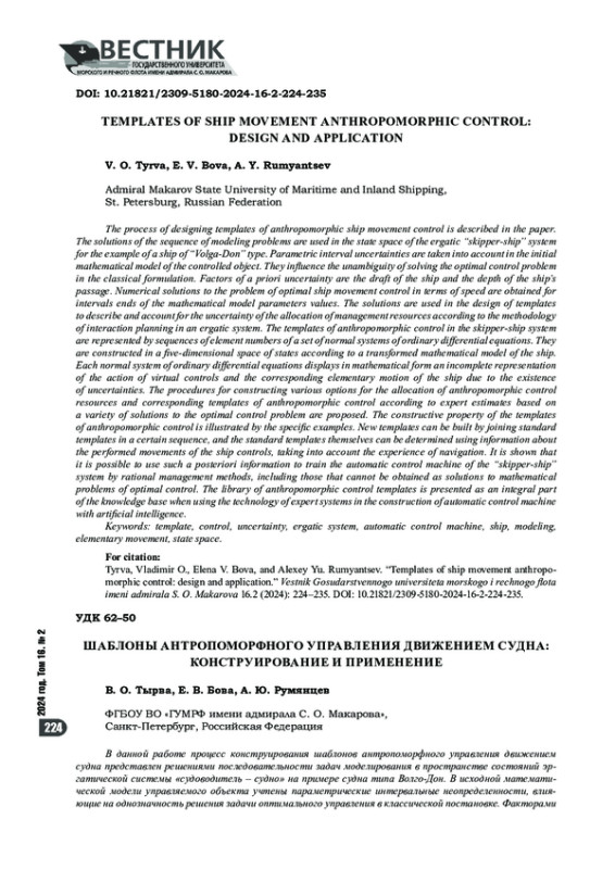 В данной работе процесс конструирования шаблонов антропоморфного управления движением судна представлен решениями последовательности задач моделирования в пространстве состояний эргатической системы «судоводитель - судно» на примере судна типа Волго-Дон. В исходной математической модели управляемого объекта учтены параметрические интервальные неопределенности, влияющие на однозначность решения задачи оптимального управления в классической постановке. Факторами априорной неопределенности являются осадка судна и глубина судового хода. Численные решения задачи оптимального по быстродействию управления перемещением судна получены для концов интервалов значений параметров математической модели. Полученные решения использованы при конструировании шаблонов для описания и учета неопределенности распределения ресурсов управления по методологии планирования взаимодействия в эргатической системе. Шаблоны антропоморфного управления в системе «судоводитель - судно» представлены последовательностями номеров элементов множества нормальных систем обыкновенных дифференциальных уравнений, построенных в пятимерном пространстве состояний по преобразованной математической модели судна. Каждая нормальная система обыкновенных дифференциальных уравнений отображает в математической форме неполное, из-за существования неопределенностей, представление о действии виртуальных органов управления и соответствующем элементарном движении судна. Предложены процедуры построения различных вариантов распределения ресурсов антропоморфного управления и его соответствующих шаблонов, составленных по экспертным оценкам, на основе множества решений задачи оптимального управления. На конкретных примерах проиллюстрировано конструктивное свойство шаблонов антропоморфного управления: новые шаблоны могут быть построены с помощью стыковки в определенной последовательности типовых аналогов, а типовые шаблоны определены с применением сведений о выполненных движениях органов управления судном с учетом опыта судовождения. Тем самым показана возможность использования таких апостериорных сведений для управления эргатической системой «судоводитель - судно» рациональными способами, в том числе такими, которые не могут быть получены с помощью решения математических задач оптимального управления. Библиотека шаблонов антропоморфного управления представлена как составная часть базы знаний при использовании технологии экспертных систем в построении управляющего автомата с искусственным интеллектом.