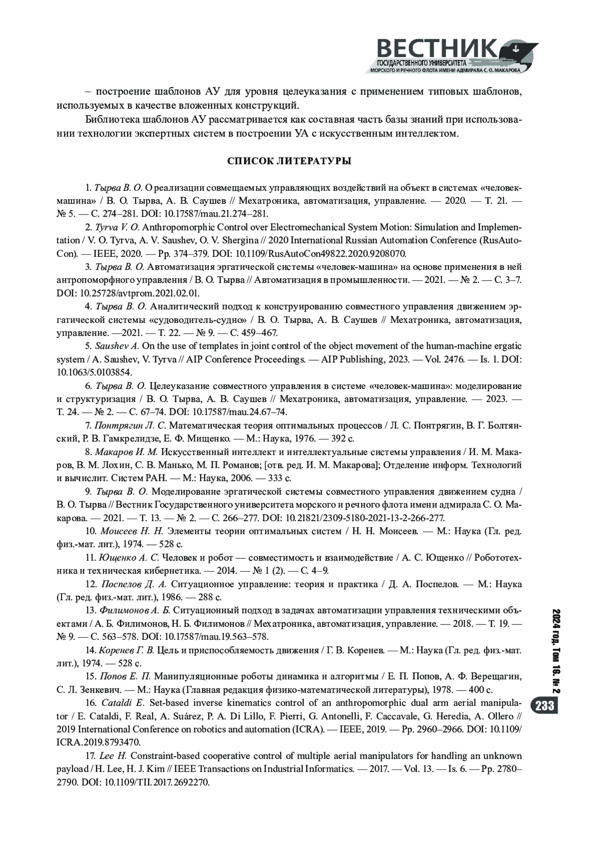 4. Тырва В. О. Аналитический подход к конструированию совместного управления движением эргатической системы “судоводитель-судно” / В. О. Тырва, А. В. Саушев // Мехатроника, автоматизация, управление. -2021. - Т. 22. - № 9. - С. 459-467. EDN: SNPENZ
