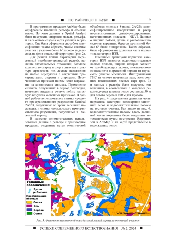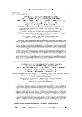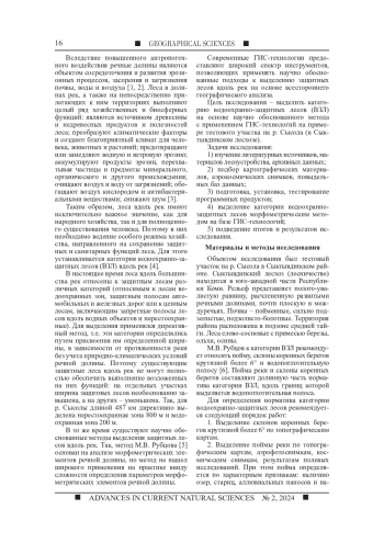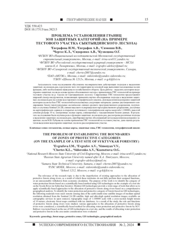 Актуальность темы исследования обусловлена несовершенством действующих подходов к выделению защитных лесов вдоль рек, в результате чего эти территории не в полной мере выполняют возложенные на них функции, либо необоснованно выведены из хозяйственного оборота. Цель работы - выделить категорию водоохранно-защитных лесов на основе научно обоснованного метода с применением ГИС-технологий на примере тестового участка на р. Сысола (в Сыктывдинском лесхозе). Современные ГИС-технологии предоставляют широкий спектр инструментов, позволяющих применять научно обоснованные подходы к выделению защитных лесов вдоль рек на основе всестороннего географического анализа. Для выделения водоохранно-защитной категории лесов на базе ГИС-технологий использовались следующие материалы: данные дистанционного зондирования Земли (многозональные космические снимки среднего пространственного разрешения, полученные со спутника Sentinal 2A\\2B, снимки высокого и сверхвысокого пространственного разрешения, доступные на картографических сервисах в открытых источниках); топографические карты масштаба 1:100000 с высотой сечения рельефа 10 м; электронные лесные карты, совмещенные с таксационными базами данных. В результате исследования были изучены роль и функции защитных лесов вдоль рек, рассмотрены различные подходы к выделению защитных лесов вдоль рек, апробирован научно обоснованный метод выделения водоохранно-защитных лесов М. В. Рубцова на основе применения ГИС-технологий на тестовом участке, дана оценка результатов выделения водоохранно-защитных лесов на рассматриваемом участке.