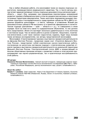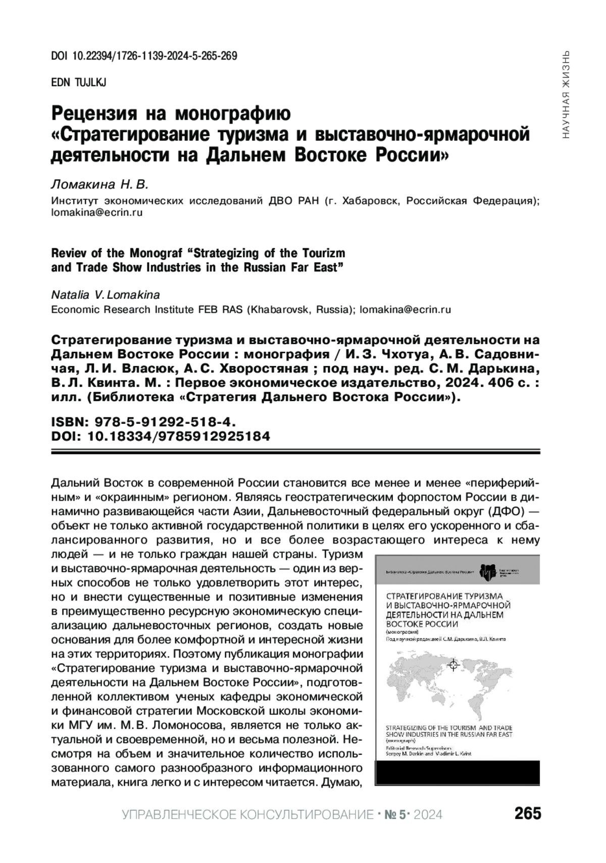 Стратегирование туризма и выставочно-ярмарочной деятельности на Дальнем Востоке России: монография / И. З. Чхотуа, А. В. Садовничая, Л. И. Власюк, А. С. Хворостяная; под науч. ред. С. М. Дарькина, В. Л. Квинта. М.: Первое экономическое издательство, 2024. 406 с.: илл. (Библиотека «Стратегия Дальнего Востока России»). ISBN: 978-5-91292-518-4. DOI: 10.18334/9785912925184