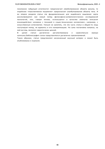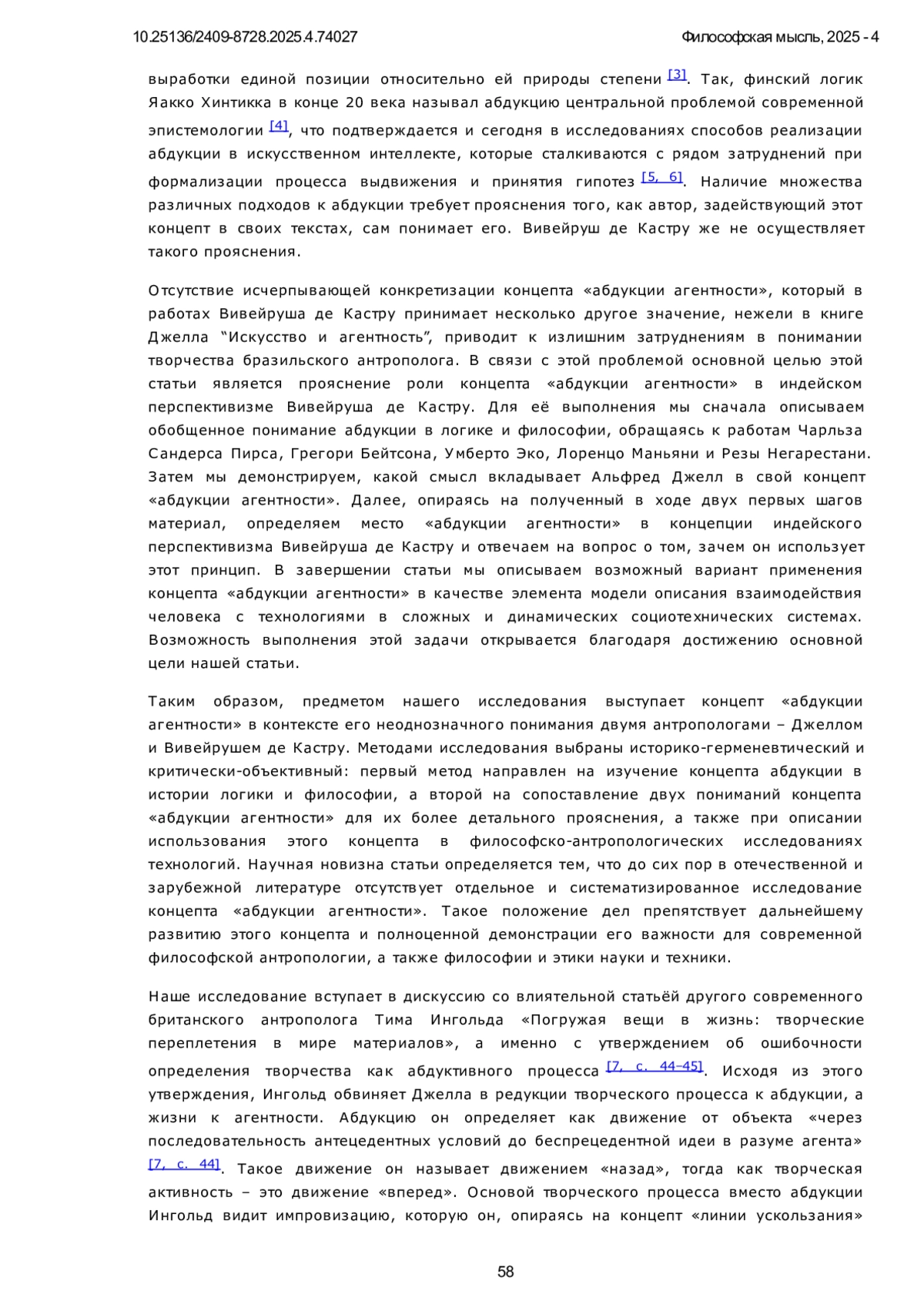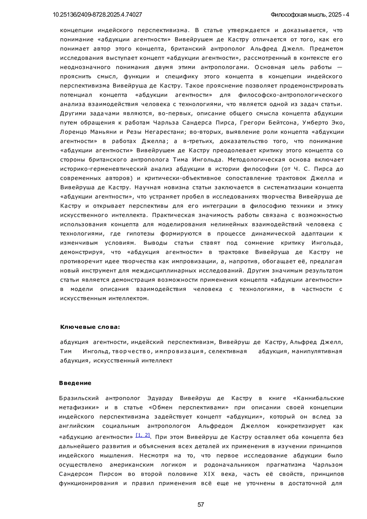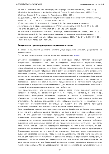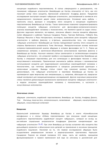 Статья посвящена исследованию концепта «абдукции агентности», задействованного бразильским антропологом Эдуарду Вивейрушем де Кастру в его концепции индейского перспективизма. В статье утверждается и доказывается, что понимание «абдукции агентности» Вивейрушем де Кастру отличается от того, как его понимает автор этого концепта, британский антрополог Альфред Джелл. Предметом исследования выступает концепт «абдукции агентности», рассмотренный в контексте его неоднозначного понимания двумя этими антропологами. Основная цель работы - прояснить смысл, функции и специфику этого концепта в концепции индейского перспективизма Вивейруша де Кастру. Такое прояснение позволяет продемонстрировать потенциал концепта «абдукции агентности» для философско-антропологического анализа взаимодействия человека с технологиями, что является одной из задач статьи. Другими задачами являются, во-первых, описание общего смысла концепта абдукции путем обращения к работам Чарльза Сандерса Пирса, Грегори Бейтсона, Умберто Эко, Лоренцо Маньяни и Резы Негарестани; во-вторых, выявление роли концепта «абдукции агентности» в работах Джелла; а в-третьих, доказательство того, что понимание «абдукции агентности» Вивейрушем де Кастру преодолевает критику этого концепта со стороны британского антрополога Тима Ингольда. Методологическая основа включает историко-герменевтический анализ абдукции в истории философии (от Ч. С. Пирса до современных авторов) и критически-объективное сопоставление трактовок Джелла и Вивейруша де Кастру. Научная новизна статьи заключается в систематизации концепта «абдукции агентности», что устраняет пробел в исследованиях творчества Вивейруша де Кастру и открывает перспективы для его интеграции в философию техники и этику искусственного интеллекта. Практическая значимость работы связана с возможностью использования концепта для моделирования нелинейных взаимодействий человека с технологиями, где гипотезы формируются в процессе динамической адаптации к изменчивым условиям. Выводы статьи ставят под сомнение критику Ингольда, демонстрируя, что «абдукция агентности» в трактовке Вивейруша де Кастру не противоречит идее творчества как импровизации, а, напротив, обогащает её, предлагая новый инструмент для междисциплинарных исследований. Другим значимым результатом статьи является демонстрация возможности применения концепта «абдукции агентности» в модели описания взаимодействия человека с технологиями, в частности с искусственным интеллектом.