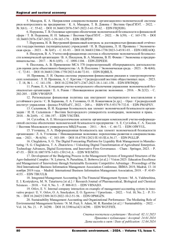 16. Cheglakova, S. G. The Digital Forecasting Platform for Liquidity Risk Management in Manufacturing / S. G. Cheglakova, T. A. Zhuravleva // Unlocking Digital Transformation of Agricultural Enterprises. Technology Advances, Digital Ecosystems, and Innovative Firm Governance. - Cham: Springer, 2023. - P. 47-55. DOI: 10.1007/978-3-031-13913-0_6 EDN: WIUMTO