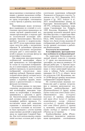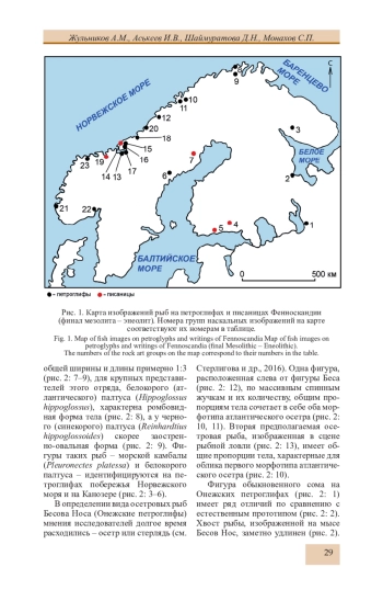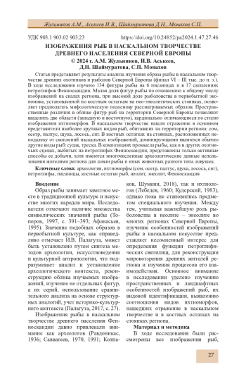 Статья представляет результаты анализа изучения образа рыбы в наскальном творчестве древних охотников и рыболов Северной Европы (финал VI - III тыс. до н. э.). В ходе исследования изучено 134 фигуры рыбы на 6 писаницах и в 17 скоплениях петроглифов Фенноскандии. Малая доля фигур рыбы по отношению к общему числу изображений на скалах региона, при высокой доле рыболовства в первобытной экономике, установленной по костным остаткам на нео-энеолитических стоянках, позволяет предполагать мифологическую подоснову рассматриваемых образов. Пространственные различия в облике фигур рыб на территории Северной Европы позволяют выделить две области (западную и восточную), кардинально отличающиеся по стилю изображения ихтиоморфов. В наскальном творчестве нашли отражение в основном представители наиболее крупных видов рыб, обитавших на территории региона: сом, осетр, палтус, щука, лосось, сиг. В костных остатках на стоянках, расположенных неподалеку от скоплений наскальных изображений, доминирующими являются обычно другие виды рыб: судак, треска. В композициях промысла рыбы, как и в других охотничьих сценах, выбитых на петроглифах Фенноскандии, представлены только активные способы ее добычи, хотя имеются многочисленные археологические данные использования жителями региона для ловли рыбы и иных животных разного типа ловушек.