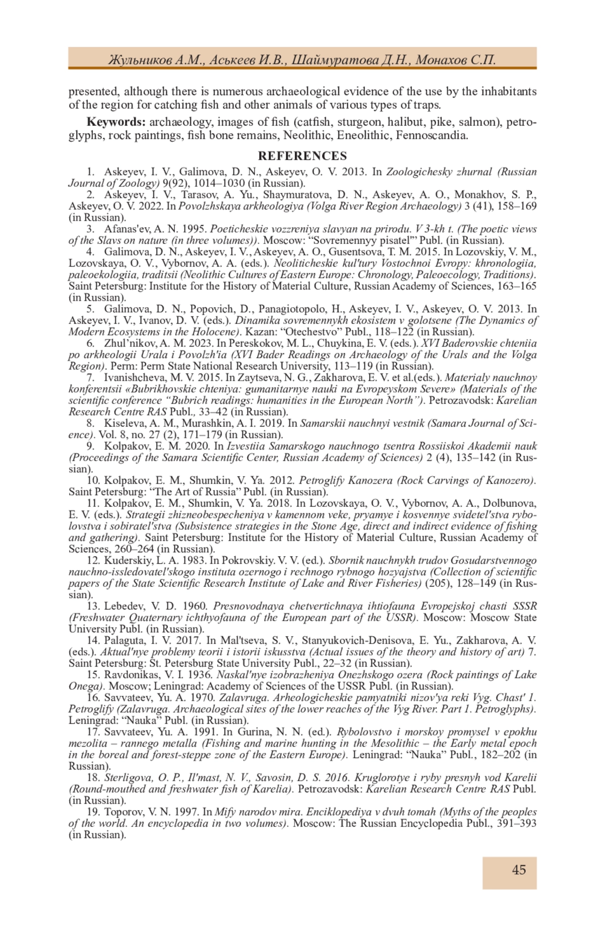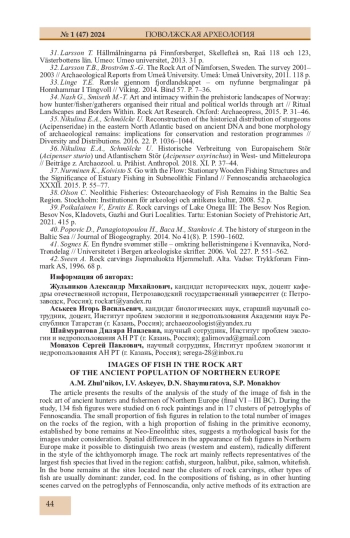 2. Аськеев И.В., Тарасов А.Ю., Шаймуратова Д.Н., Аськеев А.О., Монахов С.П., Аськеев О.В. Оценка сезонности археологического памятника по костным остаткам рыб. На примере энеолитической стоянки-мастерской Фофаново XIII на Онежском озере // Поволжская археология. 2022. № 3 (41). С. 158-169. EDN: KFHWSO