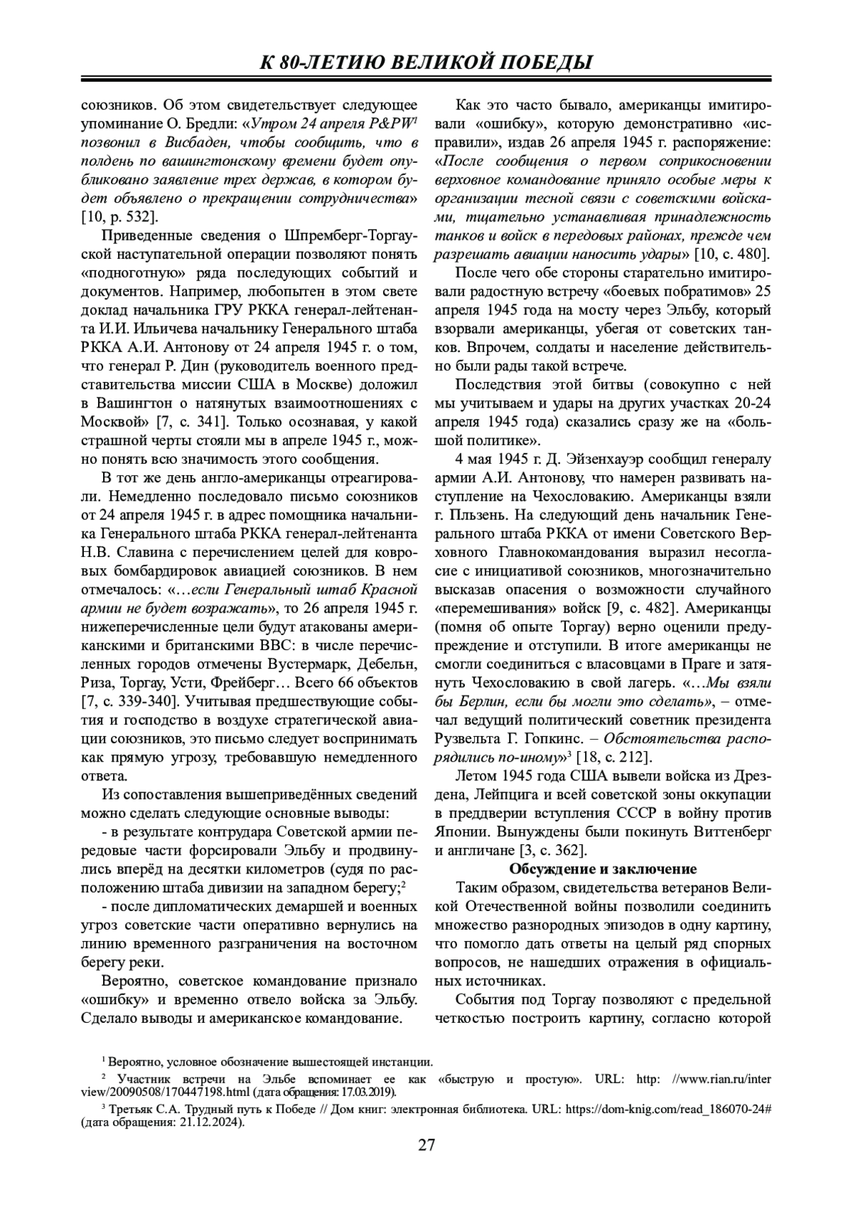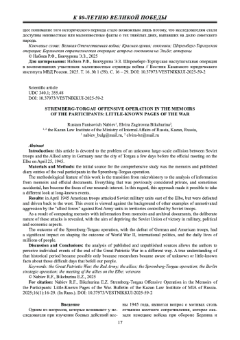 17. Набиев Р.Ф., Кабиров Д.Э. Шпремберг-Торгауская наступательная операция или почему немецкое сопротивление не снижалось до последнего дня // Сб. материалов IX Всероссийской научно-практической конференции “Историко-культурное наследие как потенциал развития туристско-рекреационной сферы” 16-18 апреля 2020, г. Казань, 2020. С. 124 - 126. EDN: MWCXBJ