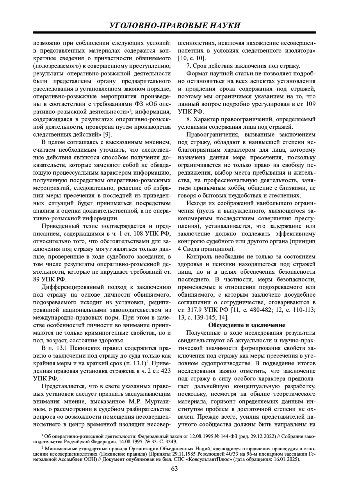 Введение: избрание меры пресечения в виде заключения под стражу представляет собой крайнюю форму государственного реагирования на совершенное преступление, последствием которого выступает существенное ограничение основополагающих прав человека, признанных на международном и национальном уровнях. С этих позиций в статье рассматриваются вопросы, касающиеся понятия, юридических свойств заключения под стражу и организационно-правового режима избрания, применения и отмены указанной меры пресечения.