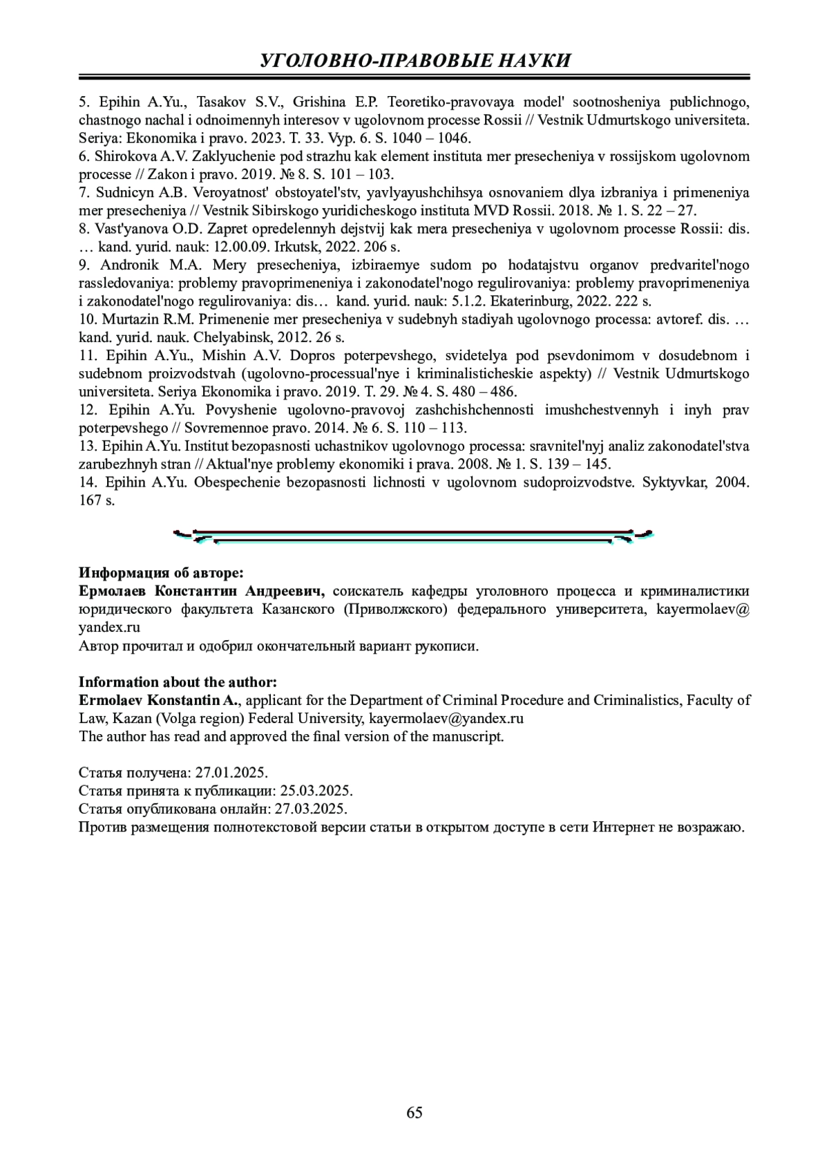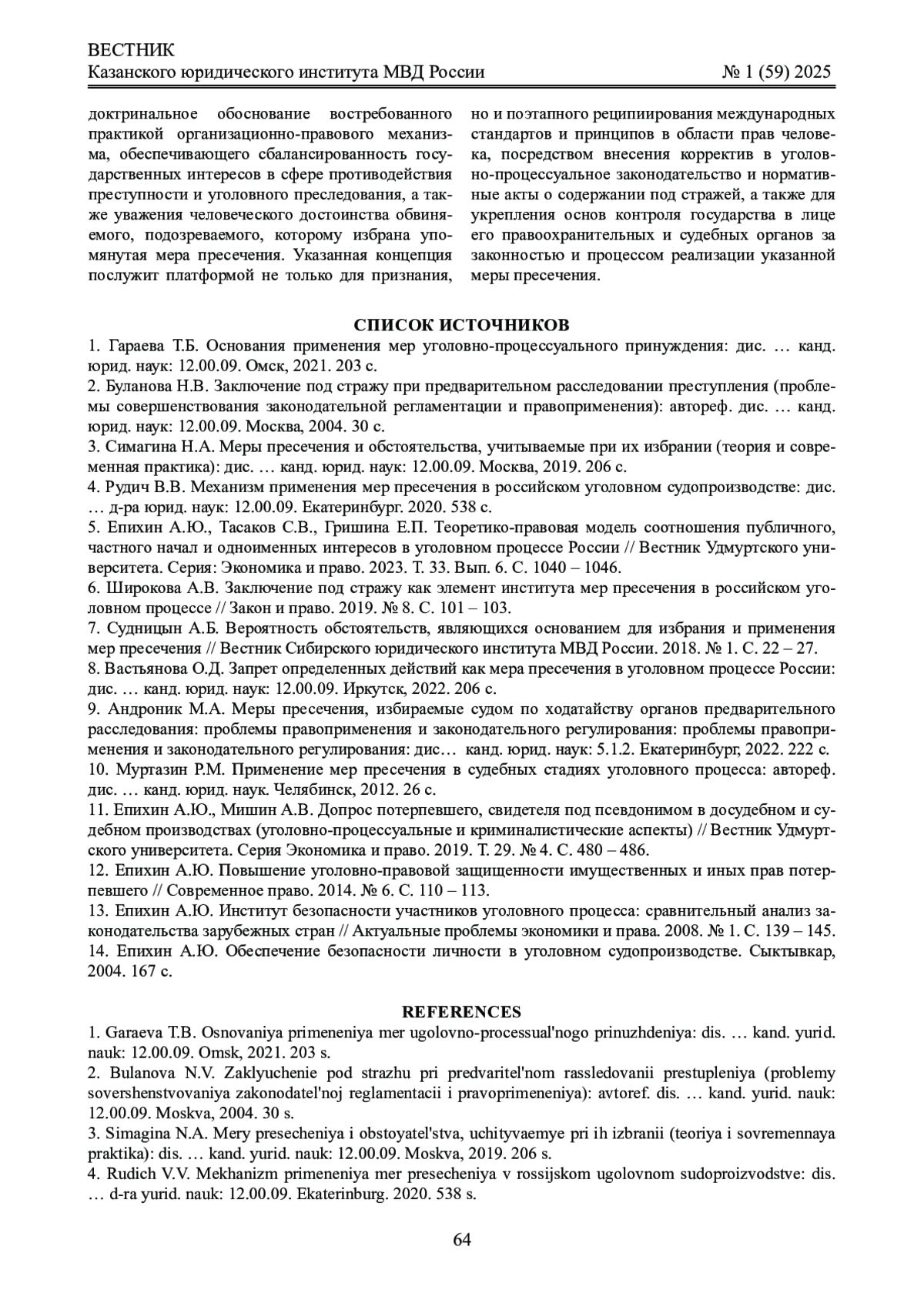 4. Рудич В.В. Механизм применения мер пресечения в российском уголовном судопроизводстве: дис. … д-ра юрид. наук: 12.00.09. Екатеринбург. 2020. 538 с. EDN: EHRIFE