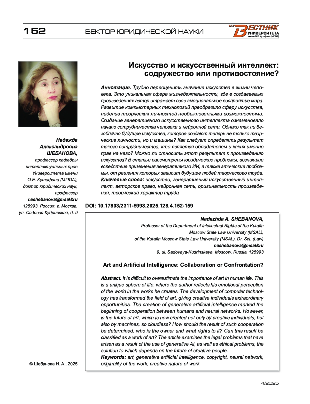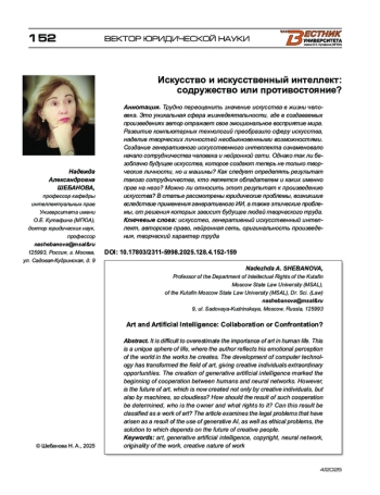 Трудно переоценить значение искусства в жизни человека. Это уникальная сфера жизнедеятельности, где в создаваемых произведениях автор отражает свое эмоциональное восприятие мира. Развитие компьютерных технологий преобразило сферу искусства, наделив творческих личностей необыкновенными возможностями. Создание генеративного искусственного интеллекта ознаменовало начало сотрудничества человека и нейронной сети. Однако так ли безоблачно будущее искусства, которое создают теперь не только творческие личности, но и машины? Как следует определять результат такого сотрудничества, кто является обладателем и каких именно прав на него? Можно ли относить этот результат к произведению искусства? В статье рассмотрены юридические проблемы, возникшие вследствие применения генеративного ИИ, а также этические проблемы, от решения которых зависит будущее людей творческого труда.